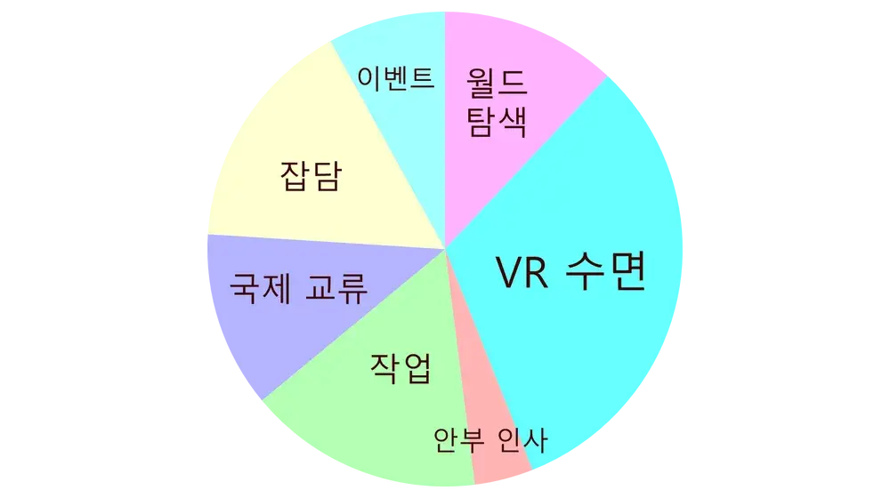 위 그림은 필자의 어느 1일을 원 그래프화한 것이다. 이처럼 24시간 전부 로그인하고 있다. 매일 이러는건 아니지만, 절대로 드물지는 않다. 화장실이나 샤워 등으로 일시적으로 로그아웃을 하는 경우는 있어도, 그런 필요 최소한의 로그아웃을 제외한다면, 생활 그 자체가 VR 공간에 이동해있는 상태가 요 몇개월 동안 이어지고 있다. 집필 작업을 VR 공간에서 하기도 한다. 좀 더 자세하게 소개해 보도록 하겠다