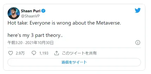 ---라고, 서두부터 날려 버렸지만, 본편에 들어가기 전 메타버스에 관한 기본적인 정보부터 짚고 넘어가도록 하자. Facebook이 「Meta」로 사명을 바꾼 후, 「메타버스」라는 말을 들을 기회가 급증했다. 애초에 메타버스란 무엇일까? 지난달에 방송 플랫폼 「Twitch」의 디렉토로 근무 중인 Shaan Puri씨가 흥미로운 트윗을 투고했다