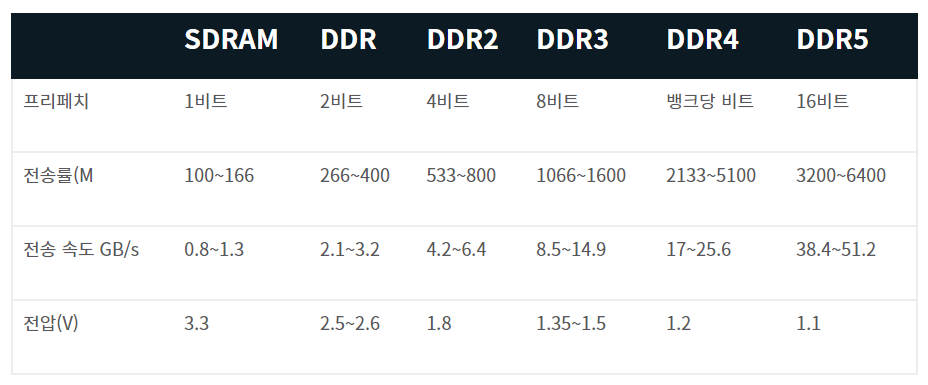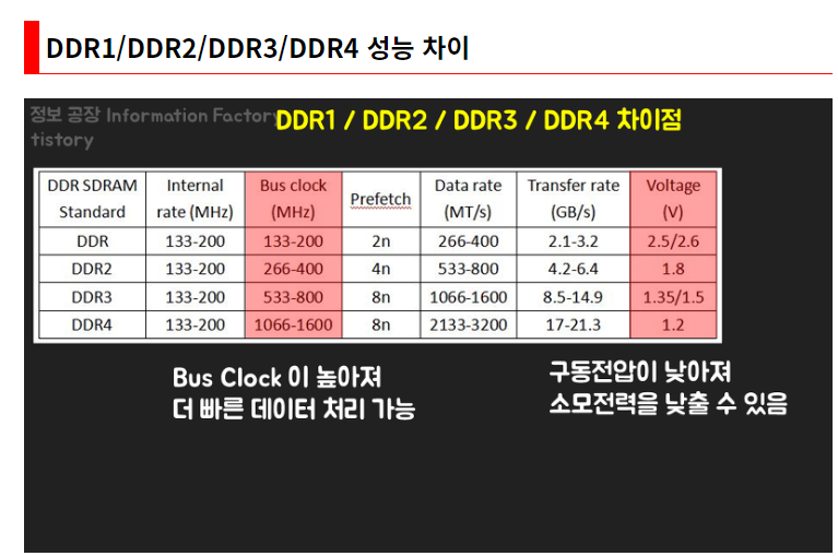 각 DDR1,2,3,4,5 가 어떤 점에서 기술발전 흐름을 갖는지를 관찰해보자.