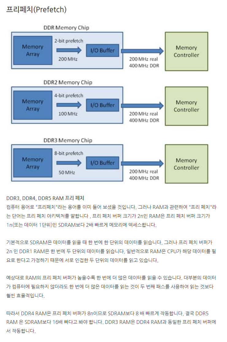 DDR은 클럭 주기당 2비트의 데이터를 메모리 어레이에서 내부 입/출력 버퍼로 전송합니다. 이것을 2비트 프리페치라고 합니다. DDR 전송 속도는 일반적으로 266MT/s~400MT/s입니다.