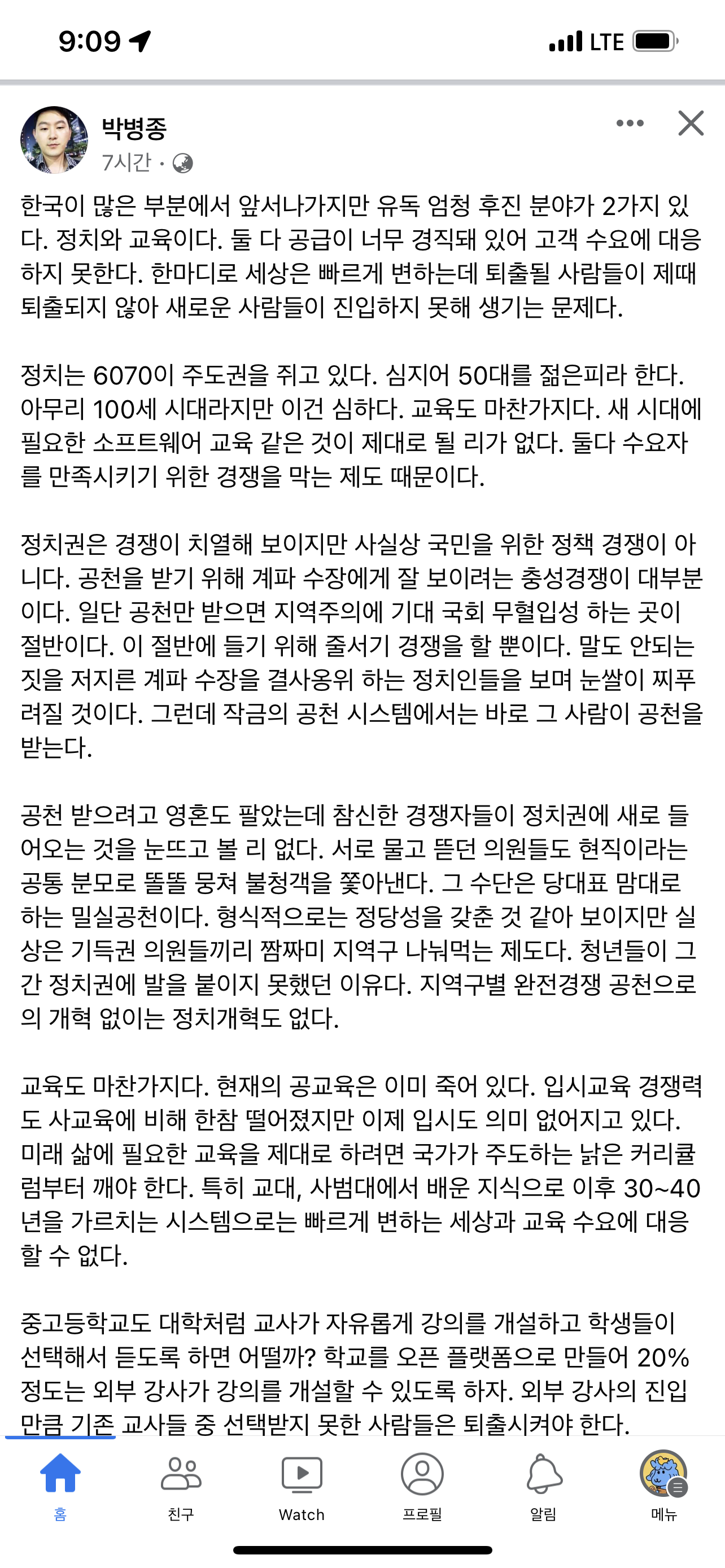 정치는 6070이 주도권을 쥐고 있다. 심지어 50대를 젊은피라 한다. 아무리 100세 시대라지만 이건 심하다. 교육도 마찬가지다. 새 시대에 필요한 소프트웨어 교육 같은 것이 제대로 될 리가 없다. 둘다 수요자를 만족시키기 위한 경쟁을 막는 제도 때문이다.