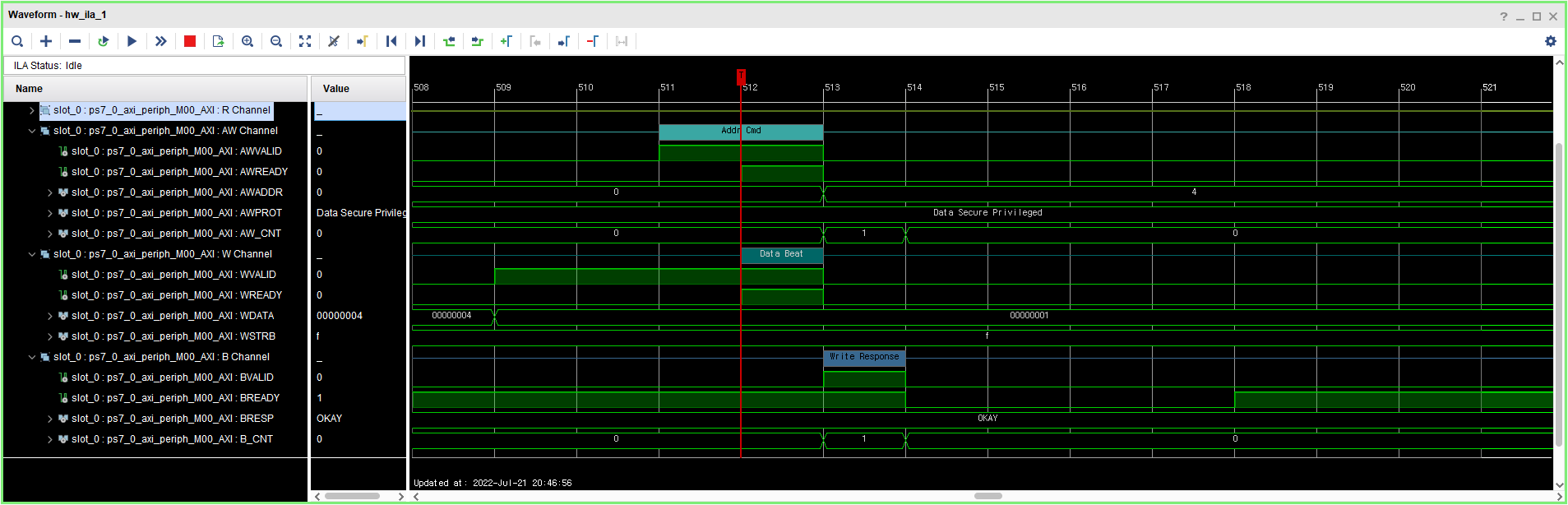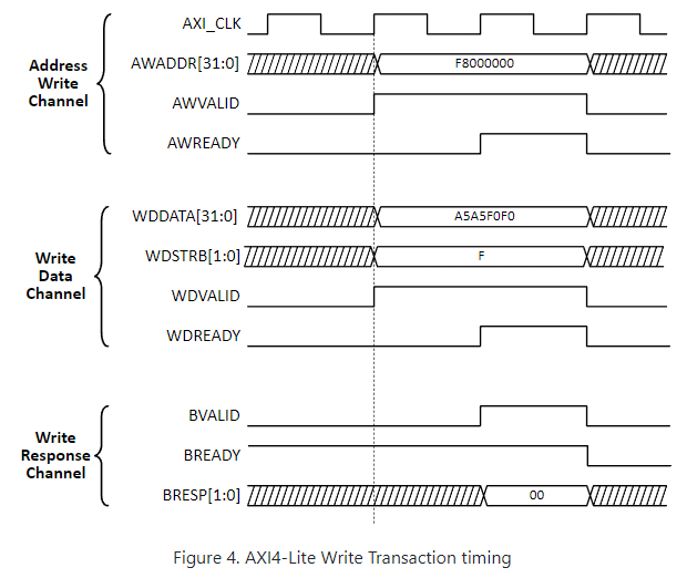 3. When the AWVALID/WREADY and WDVALID/WDREADY strobes are asserted at the same time, the handshake is complete, and all strobes are deasserted;
