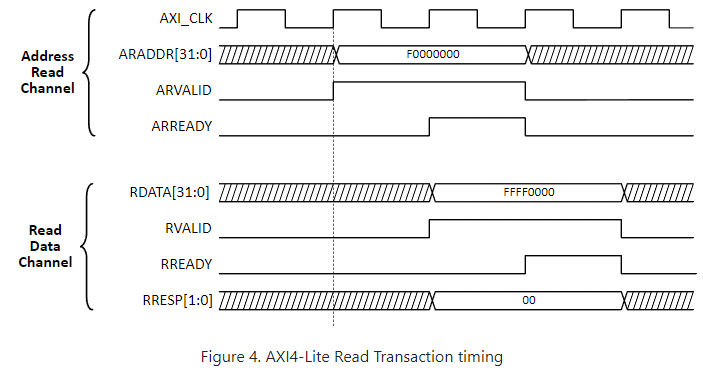 3. The slave drives the Read Data (0xFFFF0000) channel and asserts RVALID to tell the master the data is ready, and the master drives RREADY to indicate it is ready to sample the data;