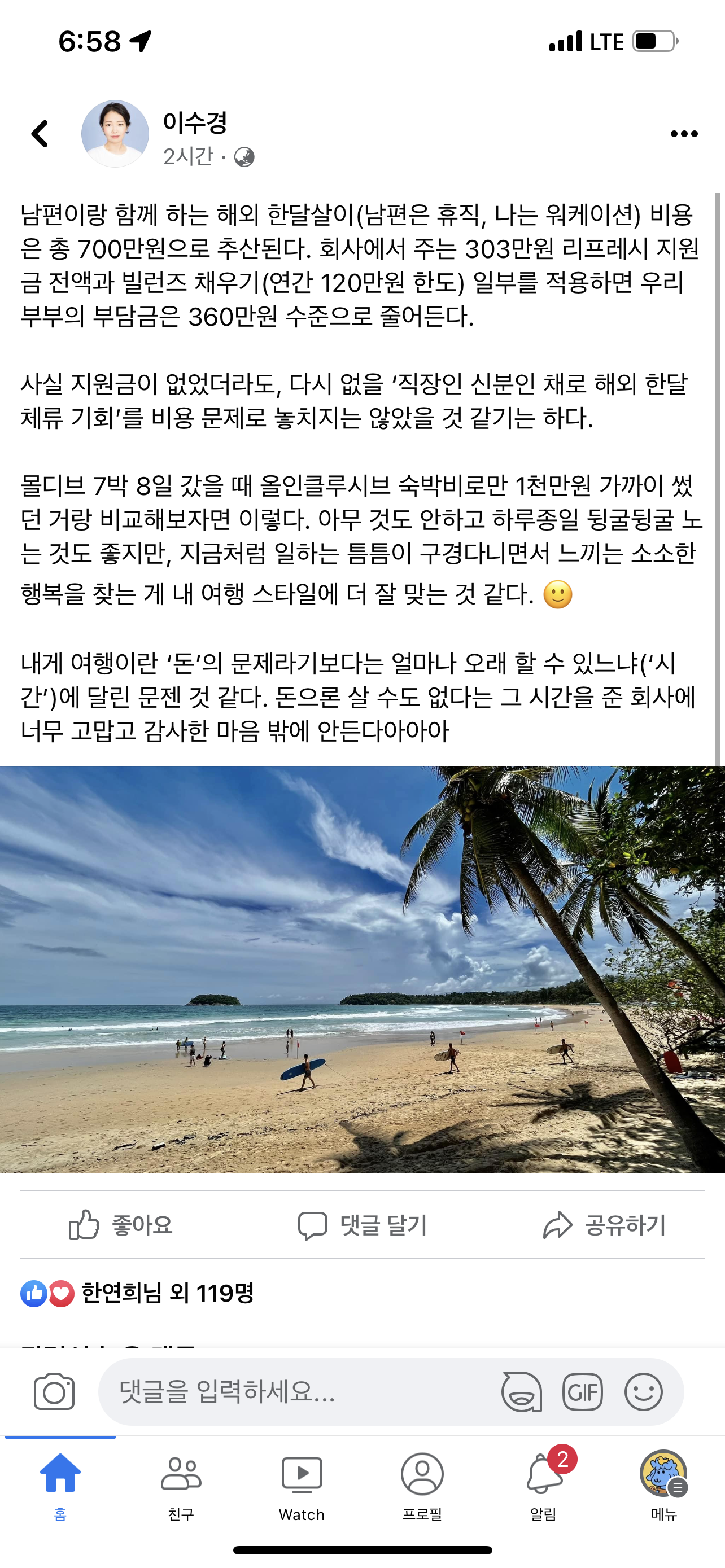 남편이랑 함께 하는 해외 한달살이(남편은 휴직, 나는 워케이션) 비용은 총 700만원으로 추산된다. 회사에서 주는 303만원 리프레시 지원금 전액과 빌런즈 채우기(연간 120만원 한도) 일부를 적용하면 우리 부부의 부담금은 360만원 수준으로 줄어든다.