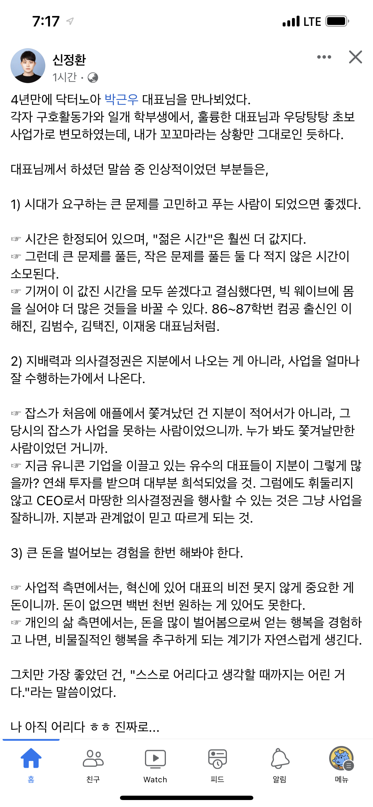 ☞ 지금 유니콘 기업을 이끌고 있는 유수의 대표들이 지분이 그렇게 많을까? 연쇄 투자를 받으며 대부분 희석되었을 것. 그럼에도 휘둘리지 않고 CEO로서 마땅한 의사결정권을 행사할 수 있는 것은 그냥 사업을 잘하니까. 지분과 관계없이 믿고 따르게 되는 것.