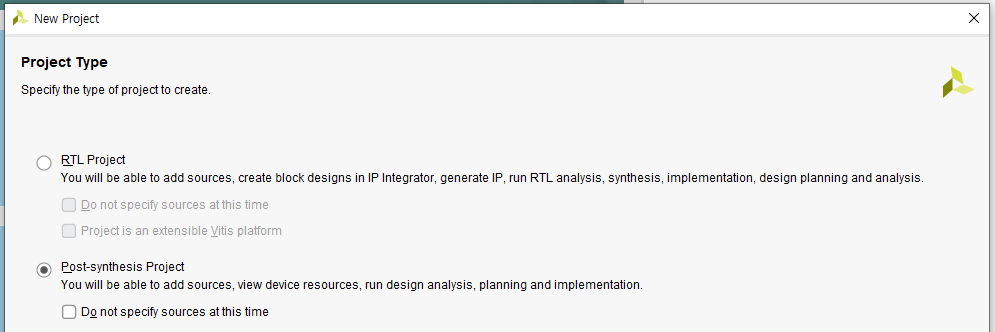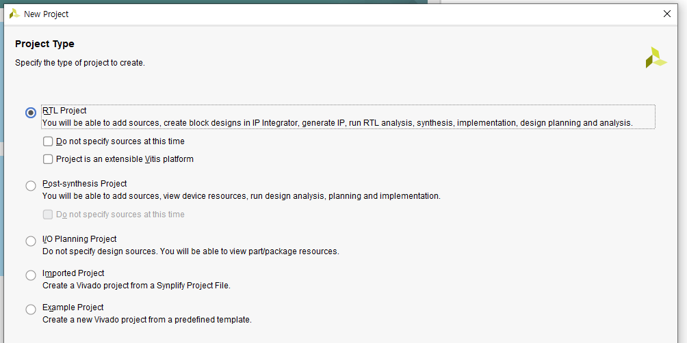 - In the Project Type page, specify the type of project to create as RTL Project. Click Next.