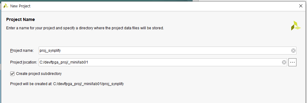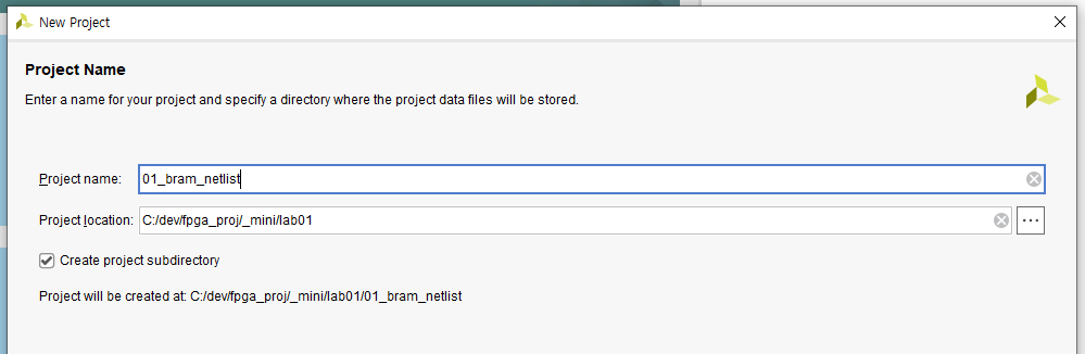 - In the Project Name page, name the new project proj_netlist and provide the project location (C:/Vivado_Debug). Ensure that Create Project Subdirectory is selected and click Next.