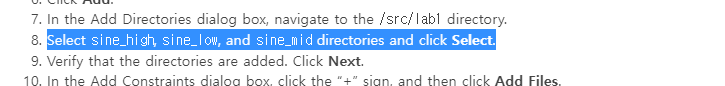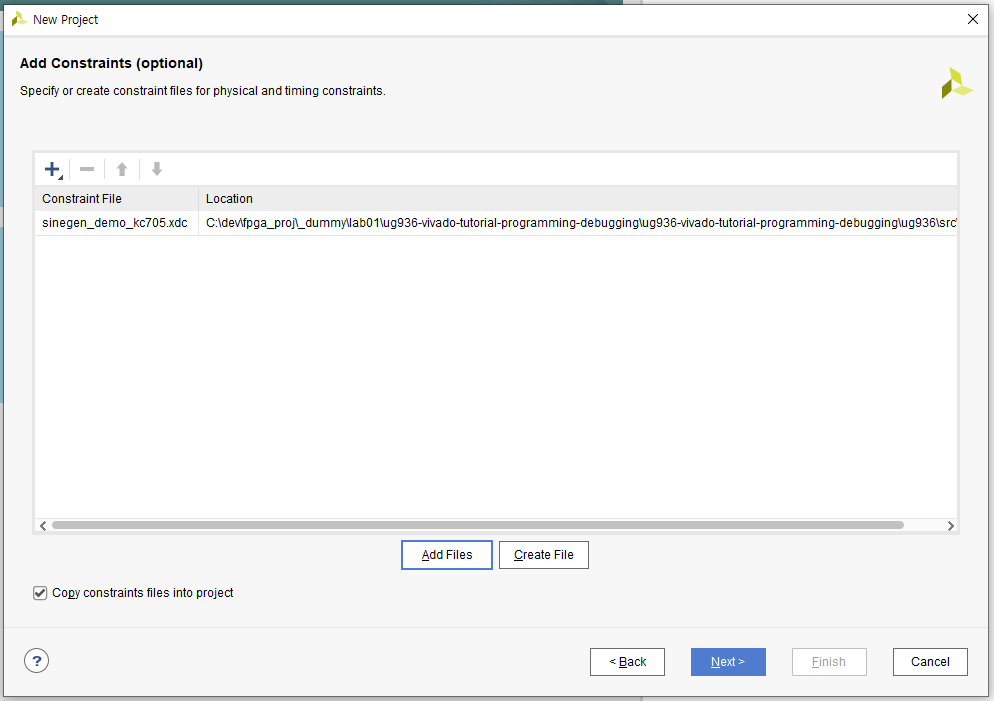 - Navigate to /src/lab1 directory and select sinegen_demo_kc705.xdc. Click Next.
