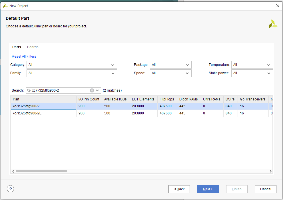 - In the Default Part dialog box, specify the xc7k325tffg900-2 part for the KC705 platform. You can also select Boards and then select Kintex-7 KC705 Evaluation Platform. Click Next.