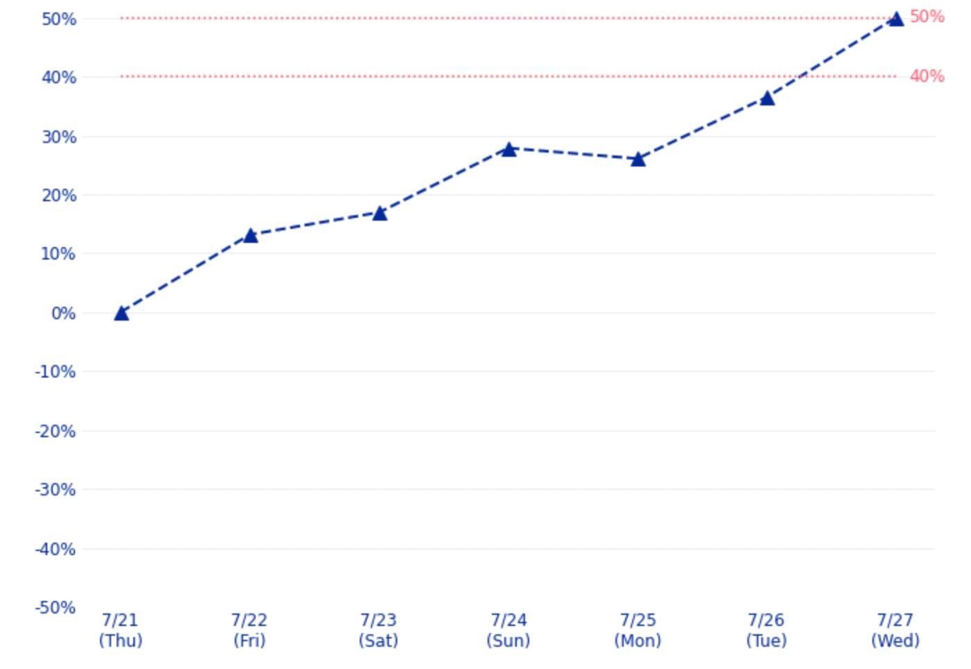 아직 중요한 업그레이드들도 앞두고 있고 갈 길은 여전히 구만리지만.. 마케팅의 도움 하나 없이 강한 성장 반등을 보여주고 있는 것은 반갑다. 아래는 전 주 대비 성장률(WoW)이다. 기저효과가 있어서 일시적으로 커보이고 언제든 내려갈 수 있는 수치인 것은 염두 해야겠지만 Y Combinator 권장치가 5~10%니 50% 찍었을 때 자랑 한 번 투척하고 간다.