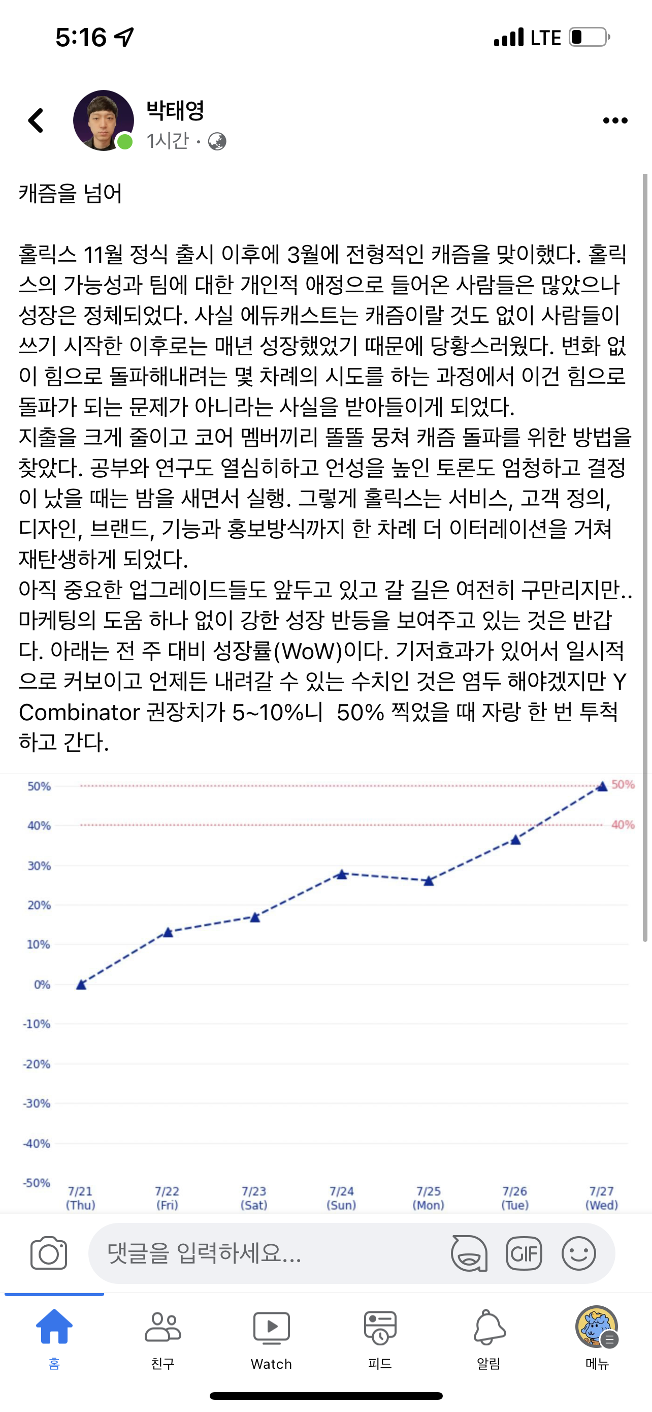 홀릭스 11월 정식 출시 이후에 3월에 전형적인 캐즘을 맞이했다. 홀릭스의 가능성과 팀에 대한 개인적 애정으로 들어온 사람들은 많았으나 성장은 정체되었다. 사실 에듀캐스트는 캐즘이랄 것도 없이 사람들이 쓰기 시작한 이후로는 매년 성장했었기 때문에 당황스러웠다. 변화 없이 힘으로 돌파해내려는 몇 차례의 시도를 하는 과정에서 이건 힘으로 돌파가 되는 문제가 아니라는 사실을 받아들이게 되었다.