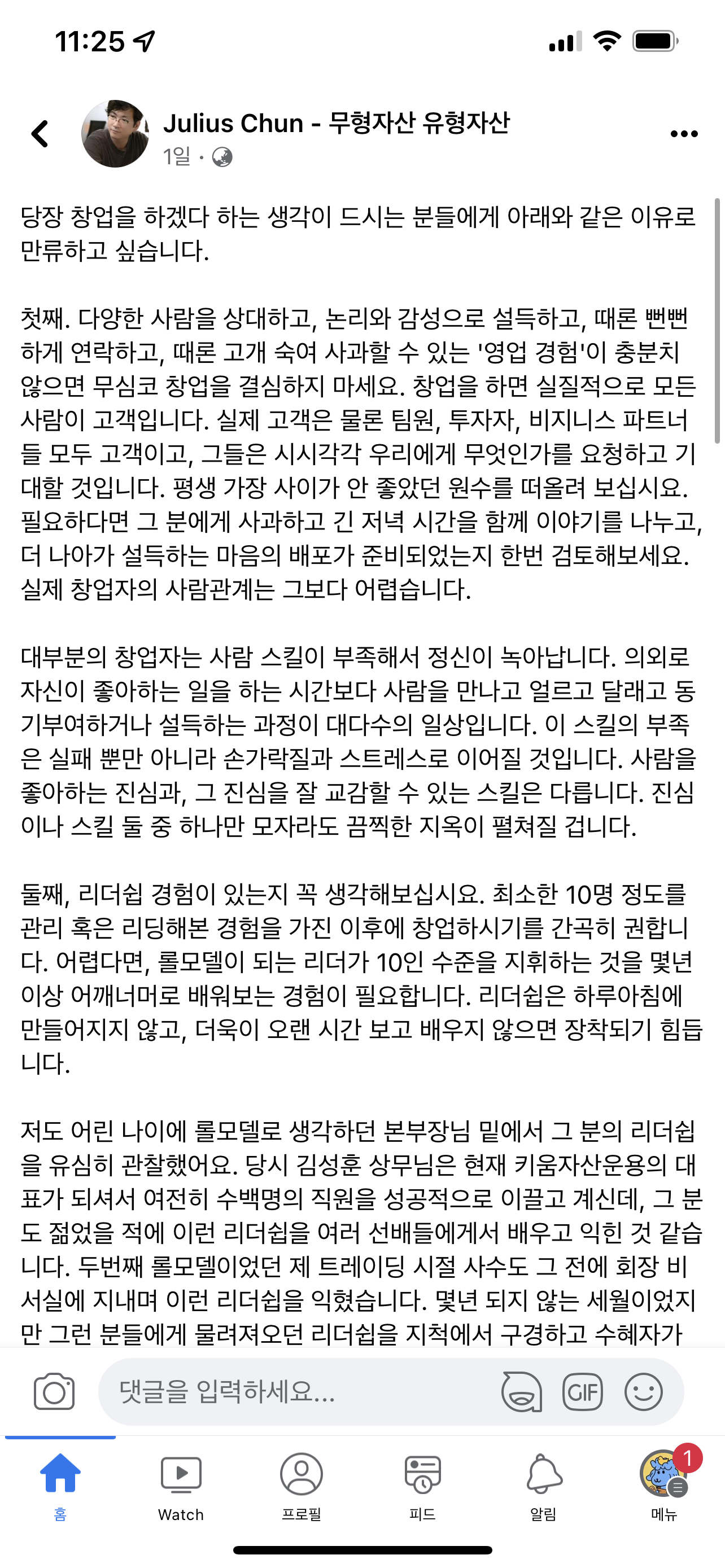저도 어린 나이에 롤모델로 생각하던 본부장님 밑에서 그 분의 리더쉽을 유심히 관찰했어요. 당시 김성훈 상무님은 현재 키움자산운용의 대표가 되셔서 여전히 수백명의 직원을 성공적으로 이끌고 계신데, 그 분도 젊었을 적에 이런 리더쉽을 여러 선배들에게서 배우고 익힌 것 같습니다. 두번째 롤모델이었던 제 트레이딩 시절 사수도 그 전에 회장 비서실에 지내며 이런 리더쉽을 익혔습니다. 몇년 되지 않는 세월이었지만 그런 분들에게 물려져오던 리더쉽을 지척에서 구경하고 수혜자가 될 시간이 없었다면 창업의 과정이 생각만 해도 아찔합니다. 저는 제 직업 특성상 이런 리더쉽을 경험할 기회가 더욱 부족했는데, 제 아무리 강한 마음이 있어도 두고두고 약점이 됩니다.