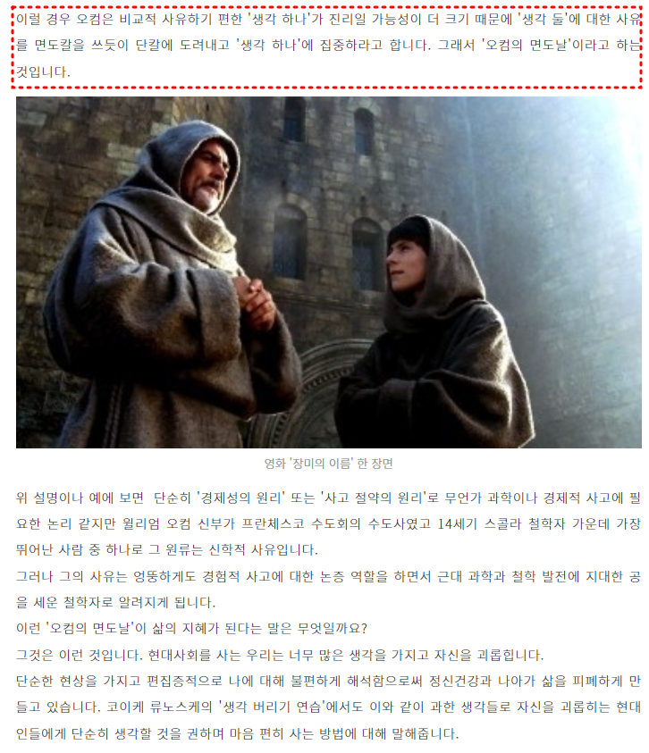 면도날로 자르면 잘려나간 자리가 깔끔하지요. 오늘은 오컴의 면도날에 대하여 알아 봅니다. 먼저 이 말이 같는 뜻은 '경제성의 원리, 검약의 원리, 또는 단순성의 원리'을 의미합니다. 14세기 영