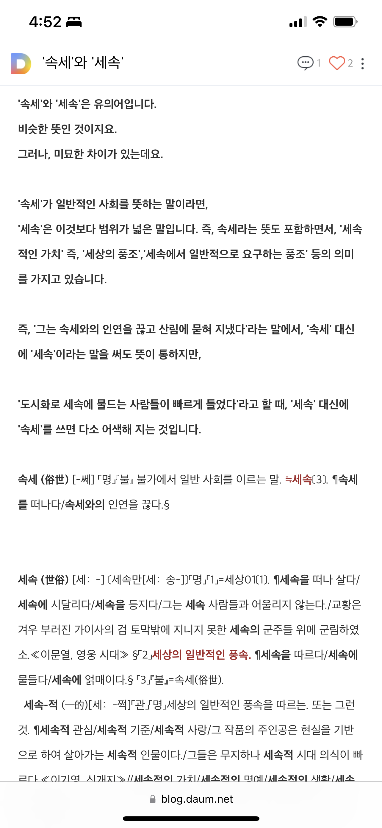 '속세'와 '세속'은 유의어입니다. 비슷한 뜻인 것이지요. 그러나, 미묘한 차이가 있는데요. '속세'가 일반적인 사회를 뜻하는 말이라면, '세속'은 이것보다 범위가 넓은 말입니다. 즉, 속세라는 뜻