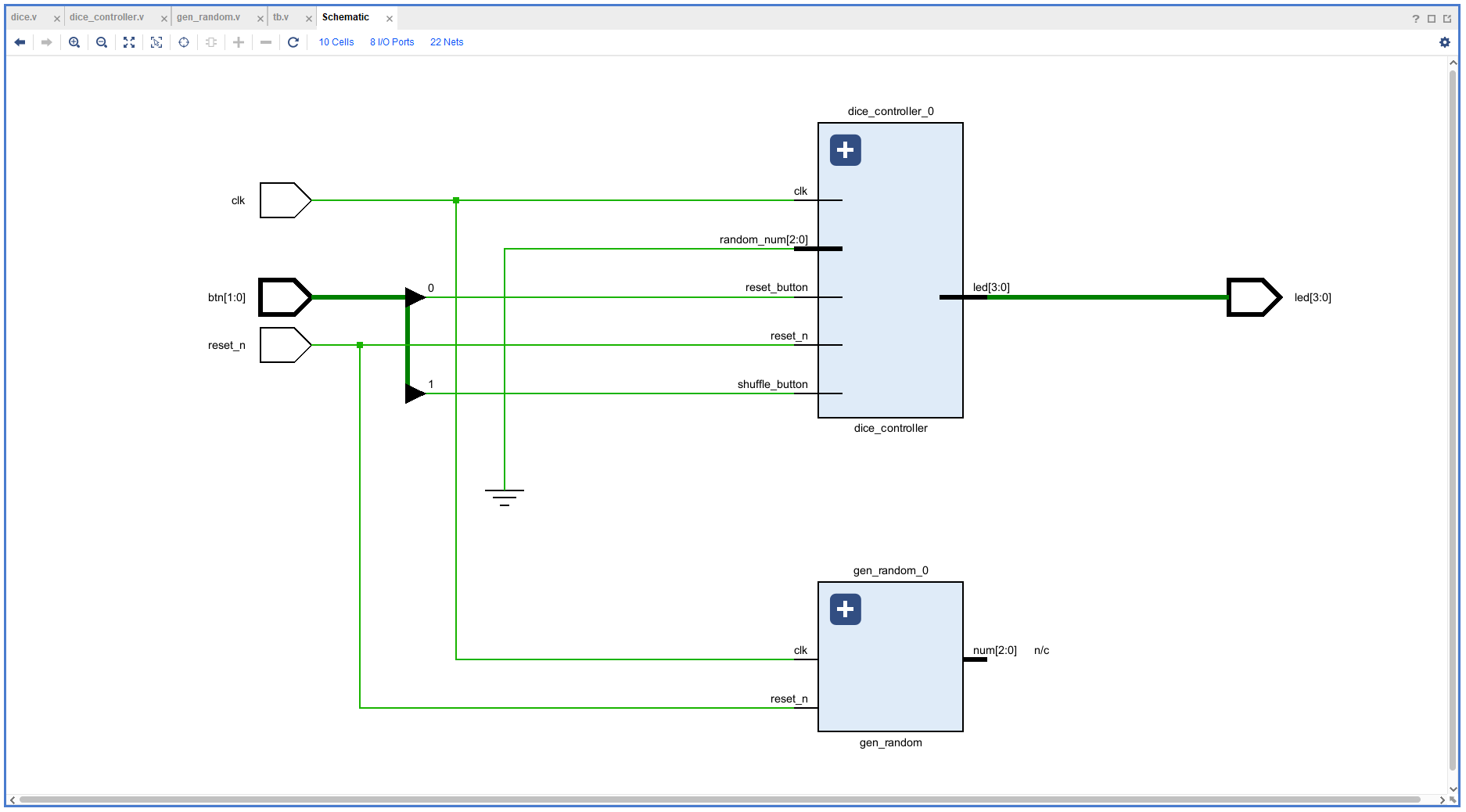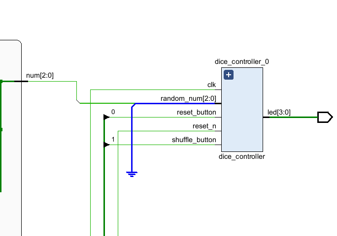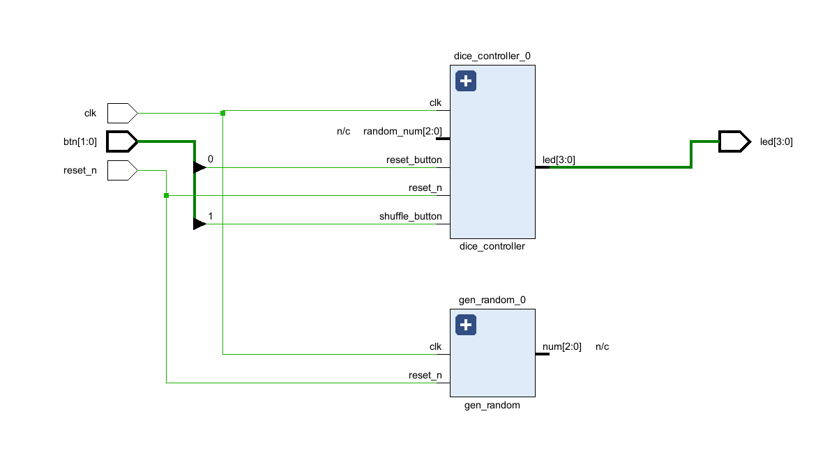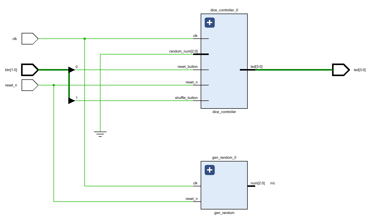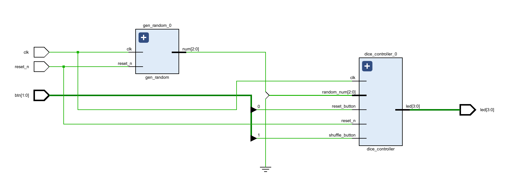dice_controller dice_controller_0 (clk, reset_n, btn[0], btn[1], num, led);