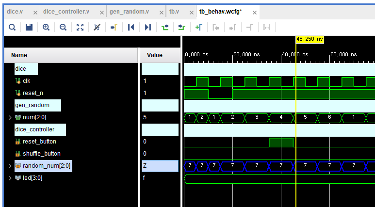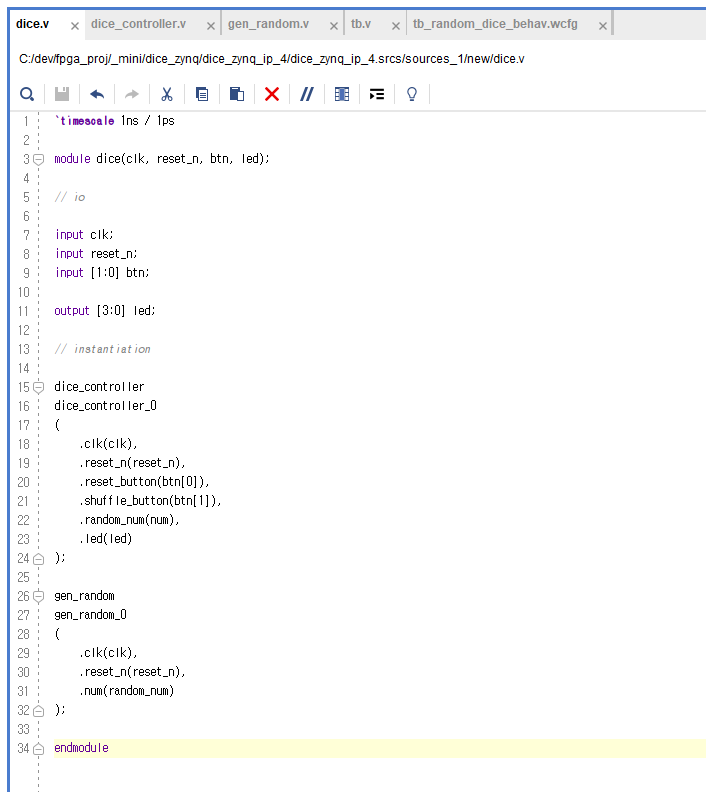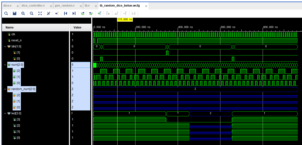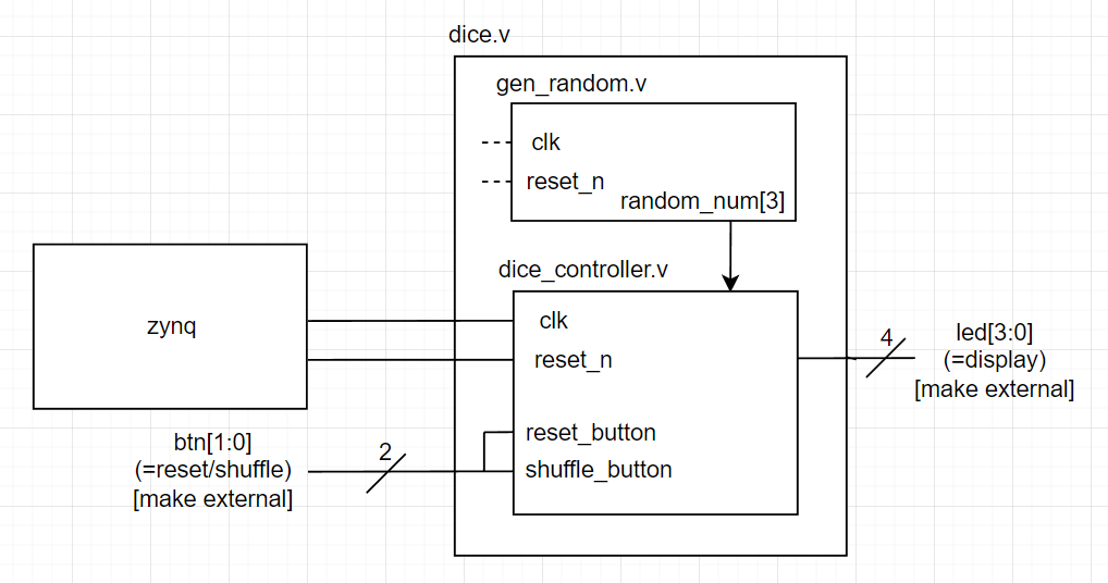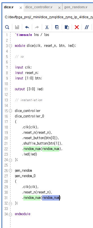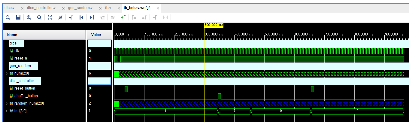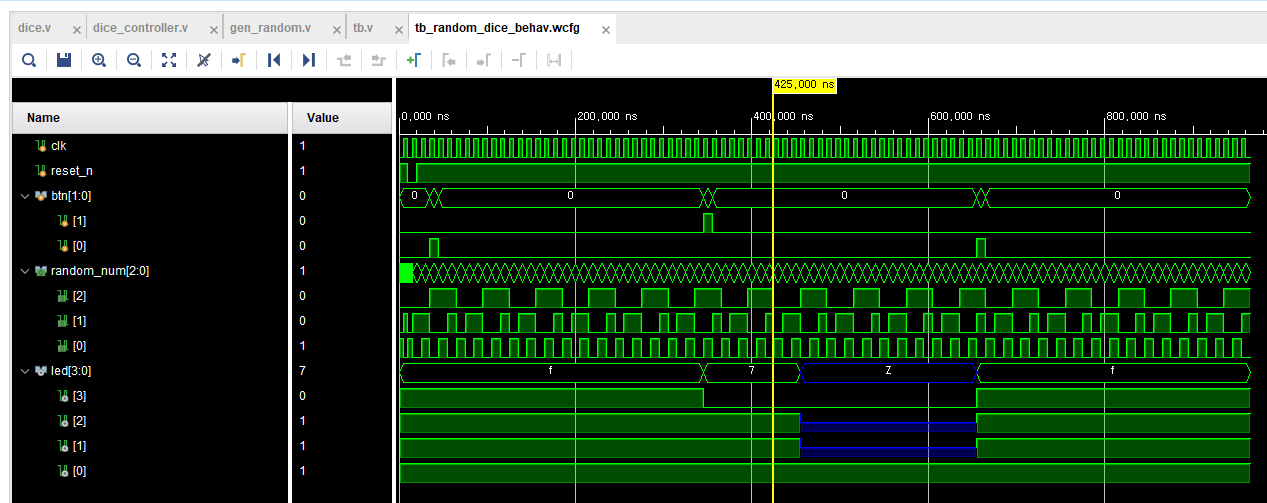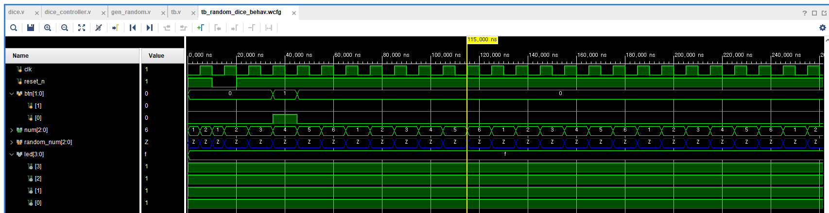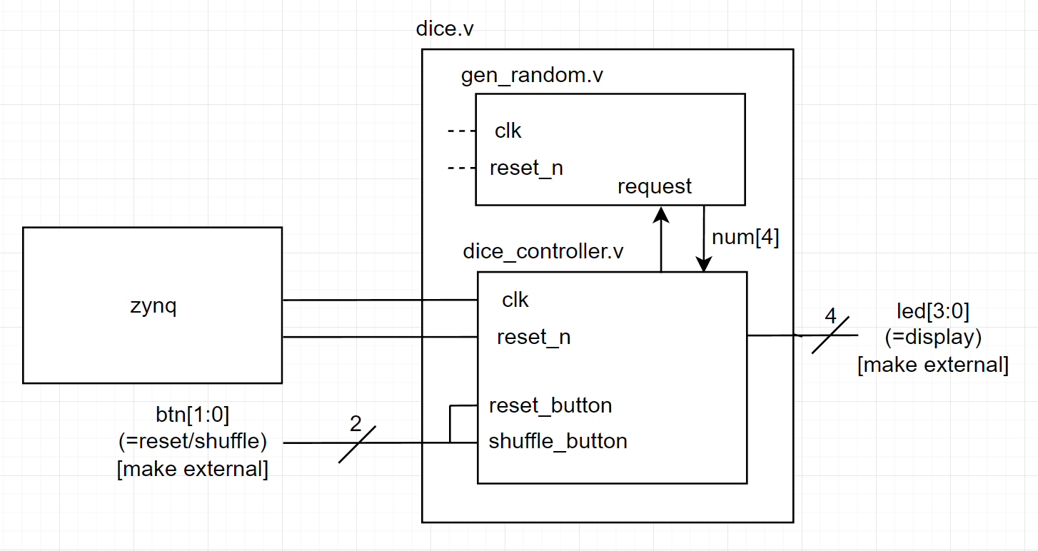 dice_controller dice_controller_0 (clk, reset_n, btn[0], btn[1], num, led);