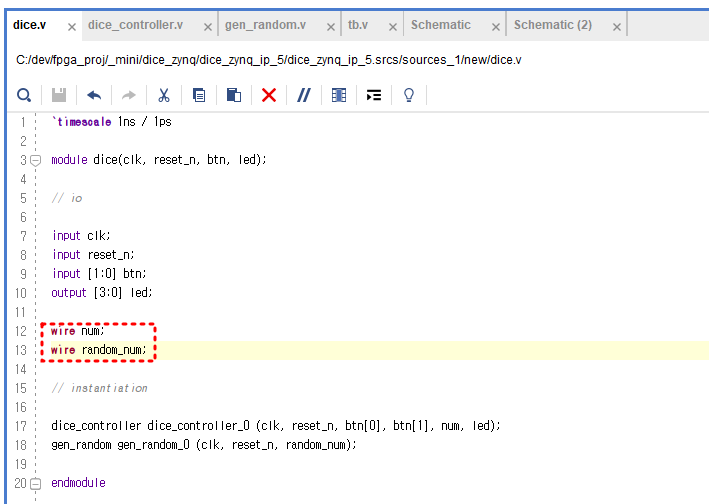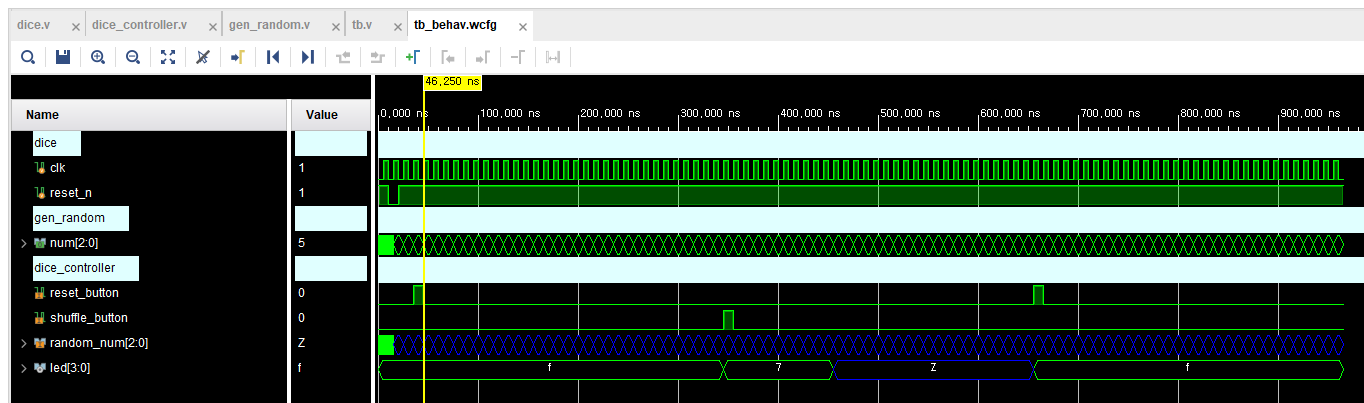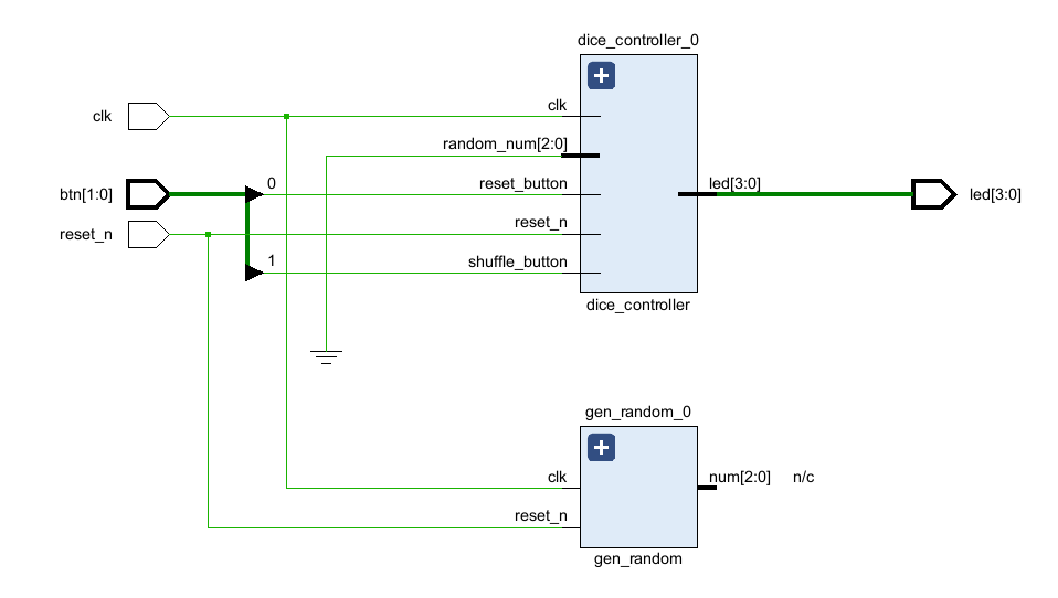 dice_controller dice_controller_0 (clk, reset_n, btn[0], btn[1], num, led);