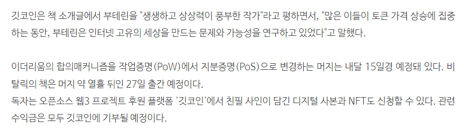 이더리움이 대형 업그레이드 '머지(Merge)'를 앞둔 가운데, 공동 창시자 비탈릭 부테린이 『지...