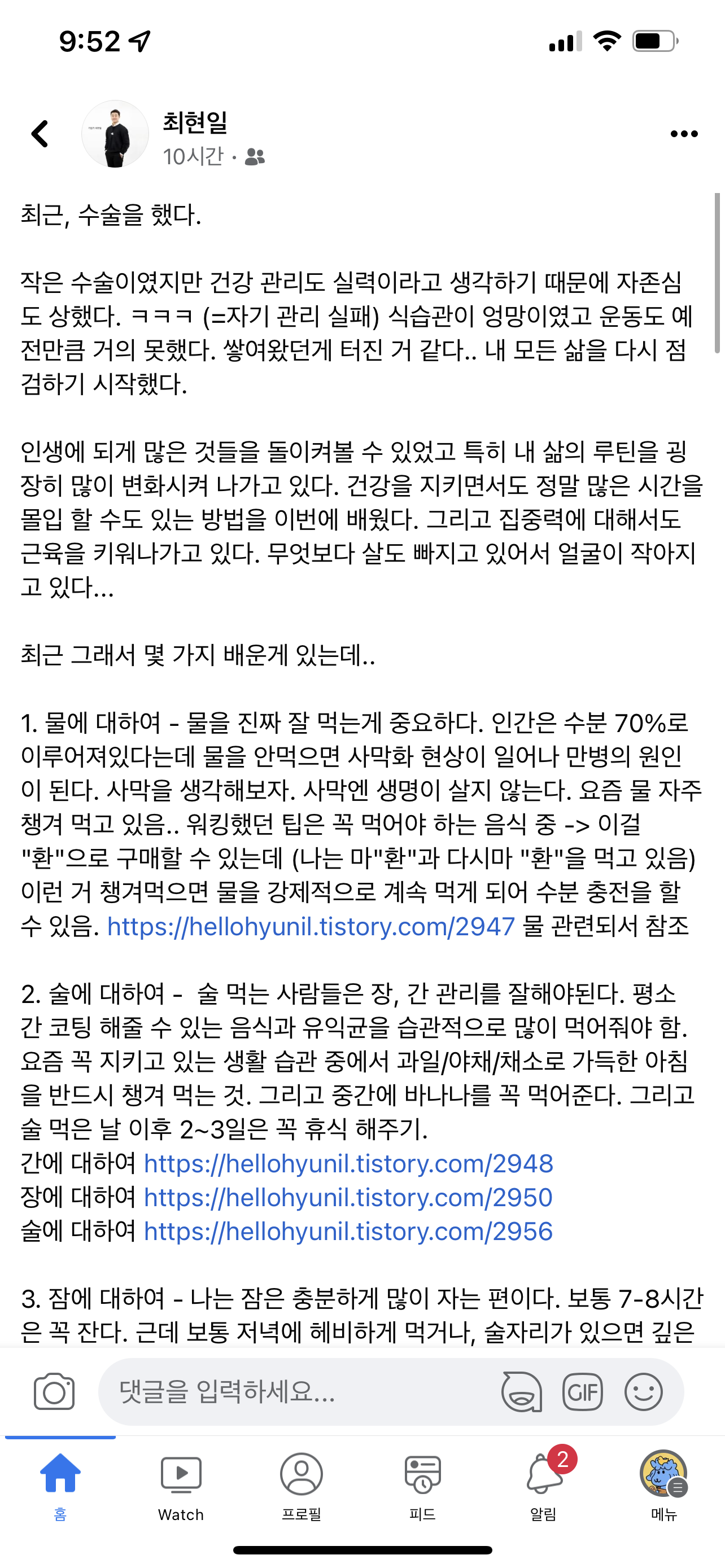 1. 물에 대하여 - 물을 진짜 잘 먹는게 중요하다. 인간은 수분 70%로 이루어져있다는데 물을 안먹으면 사막화 현상이 일어나 만병의 원인이 된다. 사막을 생각해보자. 사막엔 생명이 살지 않는다. 요즘 물 자주 챙겨 먹고 있음.. 워킹했던 팁은 꼭 먹어야 하는 음식 중 -> 이걸 "환"으로 구매할 수 있는데 (나는 마"환"과 다시마 "환"을 먹고 있음) 이런 거 챙겨먹으면 물을 강제적으로 계속 먹게 되어 수분 충전을 할 수 있음. https://hellohyunil.tistory.com/2947 물 관련되서 참조