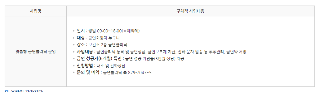 <!-- 코로나로 중단돼서 잠시 주석처리(금연클리닉만 새 테이블로 노출) 금연사업 관련 사업종류와 내용 사업명 세부사업명 구체적 사업내용 맞춤형 금연클리닉 운영 금연클리닉 운영 일시 평일