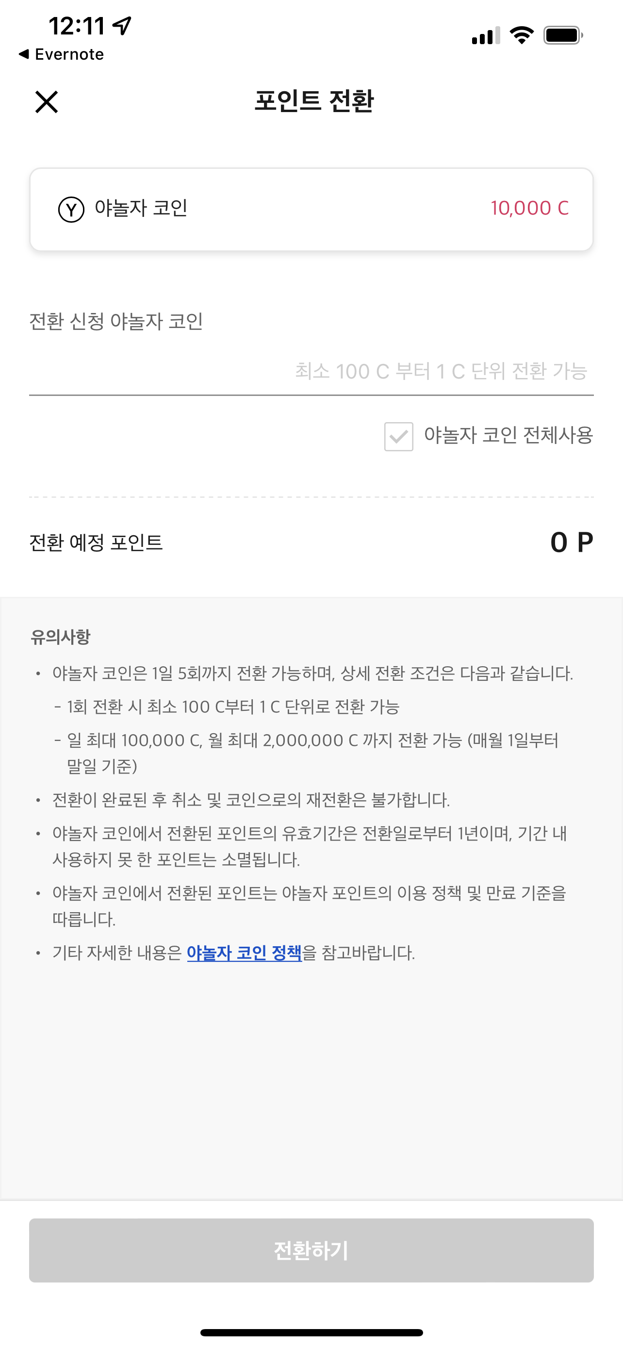 1C(코인)은 1P(포인트)로 1:1비율로 전환됩니다.