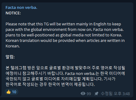 본 텔레그램 방은 앞으로 글로벌 환경에 발맞추어 주로 영어로 작성될 예정이니 참고해주시기 바랍니다. Facta non verba.는 한국 미디어에 국한되지 않고 글로벌 미디어로 자리매김할 계획입니다. 기사가 한국어로 작성되는 경우 한국어 번역이 제공됩니다.
