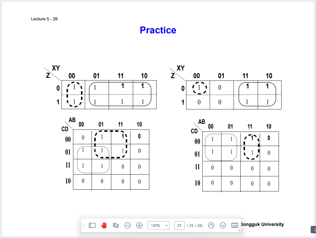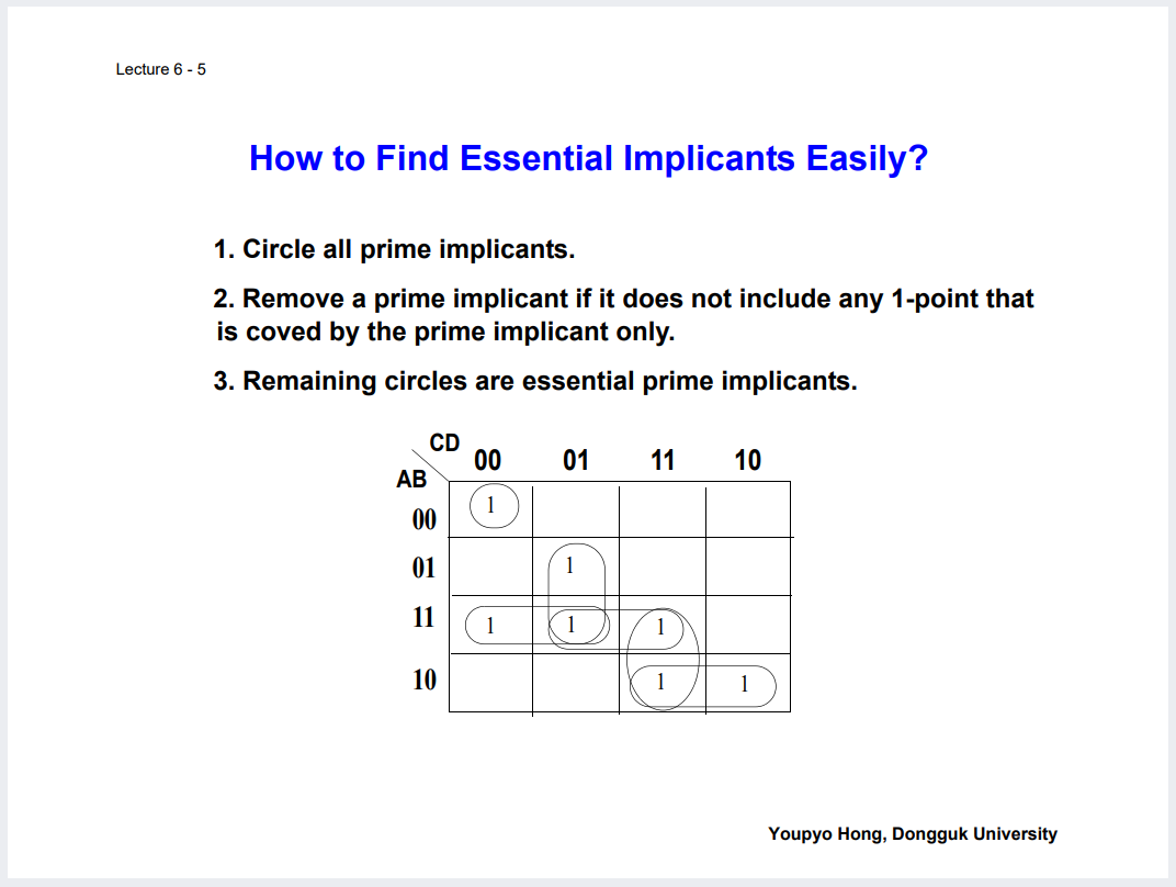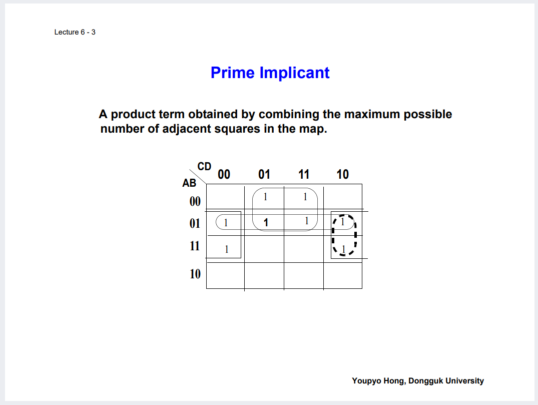 카르노맵은 어느정도 다 기억나는군. Prime Implicant 찾아서, 순서대로 접근하는 방법론.