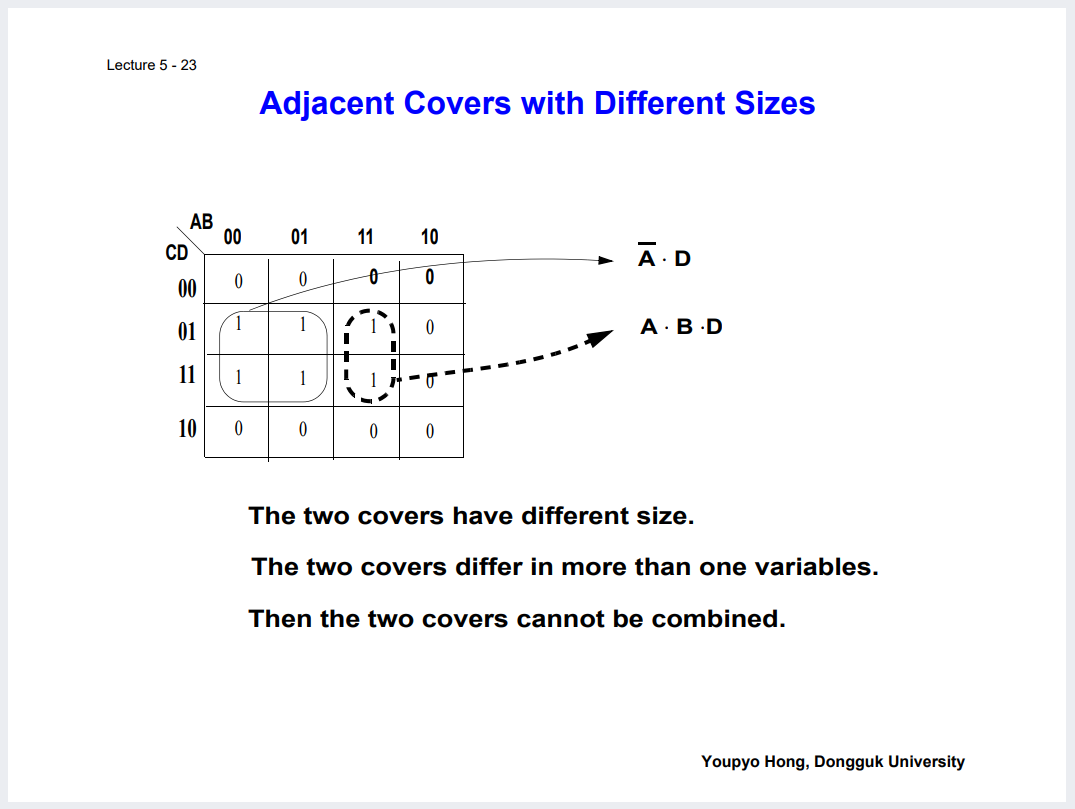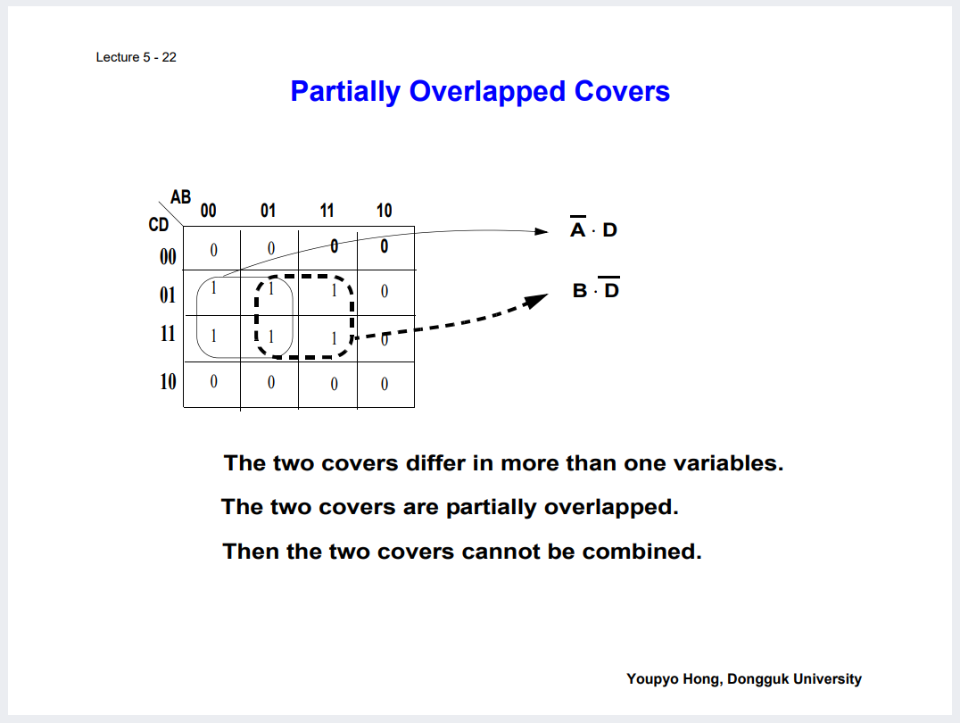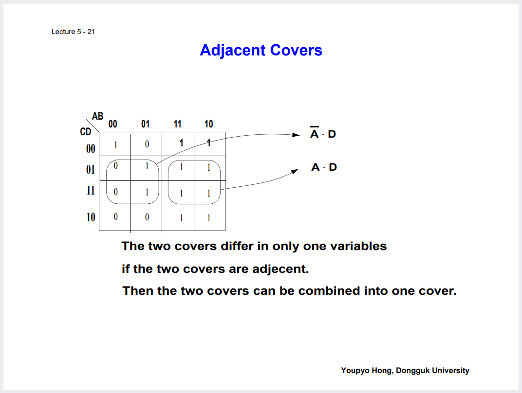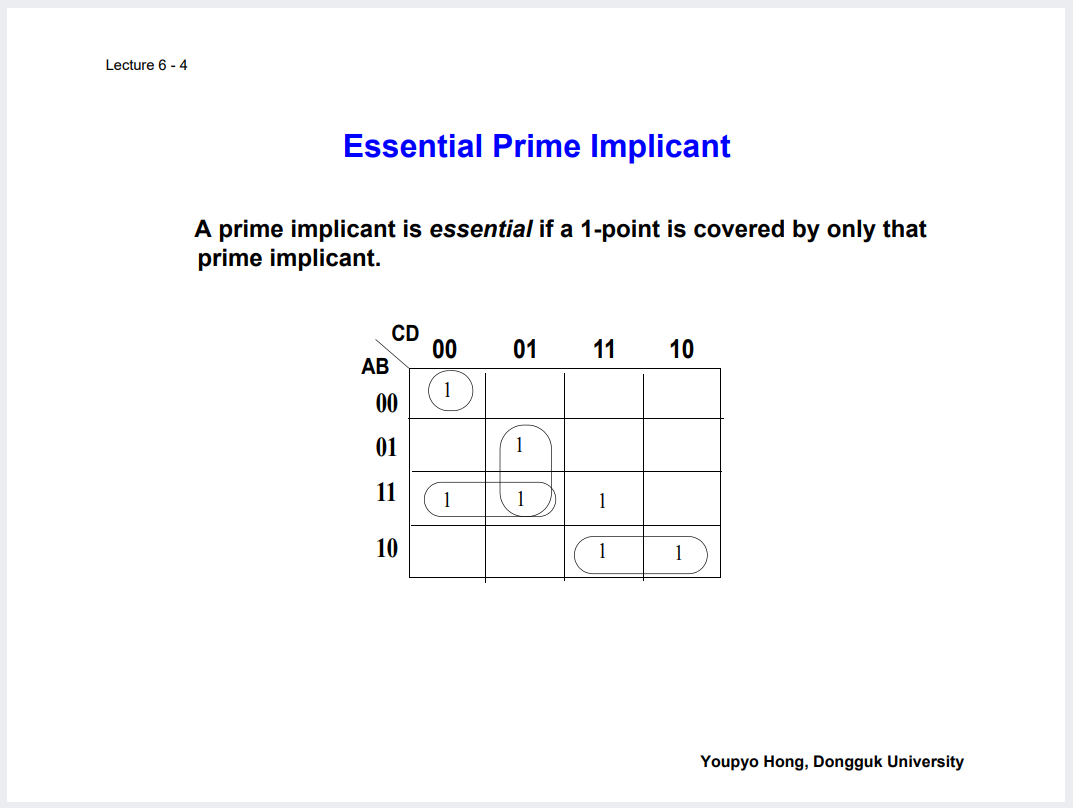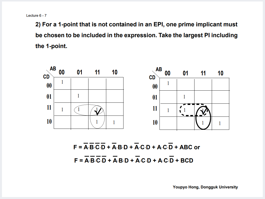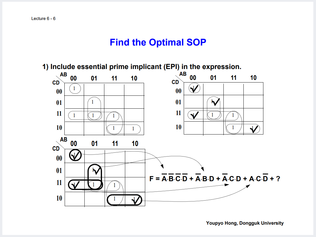 그래서, 그러나, Optimal SOP를 찾기 위해서는 하나가 결정된다기보다는 OR 꼴로 존재할 수 있음.