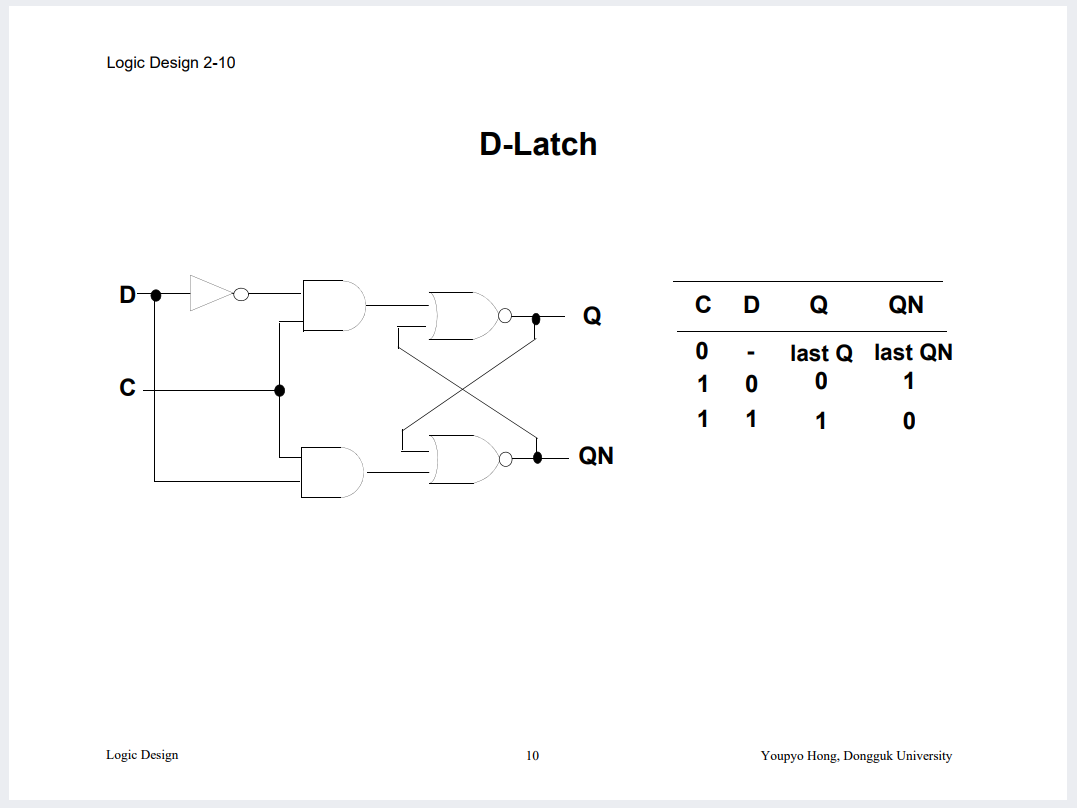 FF는 물려있는 값을, Clock timing(at rising edge)에 맞추어 뱉어준다. 그리고 그것은 Latch를 통해 구현된다.