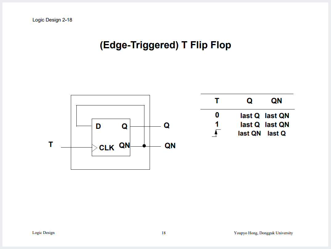 그리고 JK FF에서 00, 11 일때의 로직만을 활용하기 위한 T FF도 있다.