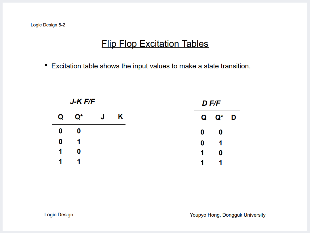FF는 state transition을 보여줄 수 있는 Excitation Table을 통해 표현해준다.