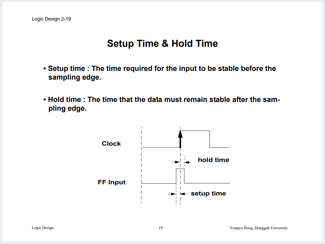 FF이 Input을 인식하기 위해, 최소한의 Setup후에 들어와주어야 하고, 일정시간을 또 Hold 해주어야 한다.