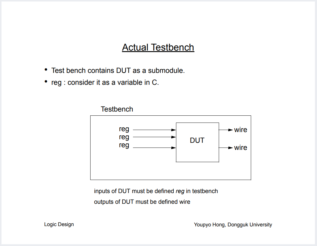 Testbench는 DUT가 올바르게 작동하는지 확인하기 위한 test pattern module 이다.