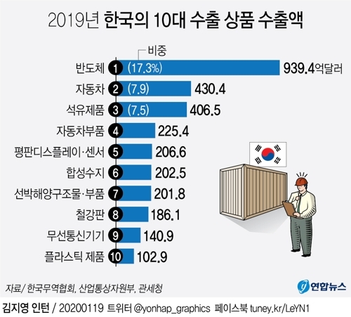 (서울=연합뉴스) 고은지 기자 = 지난해 한국 수출에서 반도체가 차지하는 비중이 20% 선을 넘지 못했다.