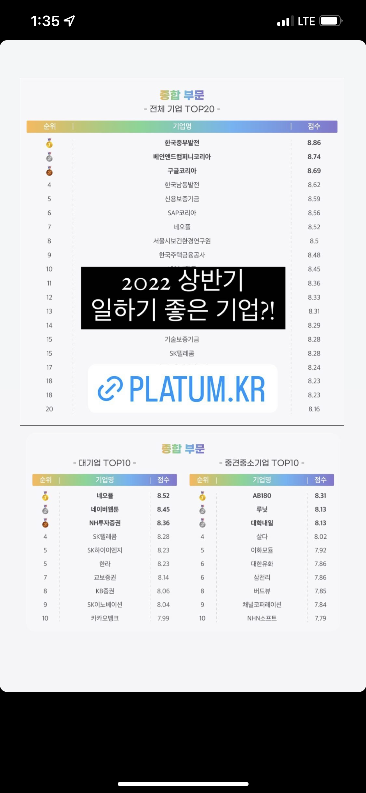 2022 일하기 좋은 기업 https://platum.kr/archives/192144?fbclid=IwAR0GJYoivqEFIdFbPGxp7QKuhZOJ2tKKXWf_0cGACNcKtOzGudYRouRcqoY 직원이 평가한 ‘2022 상반기 일하기 좋은 기업 platum.kr 사업 모티프2/팀&조직&사람&문화 2022.09.06