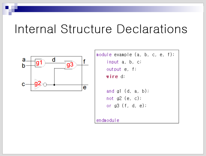 Verilog (복습 1~3) Lecture 1 : Introduction to Verilog 베릴로그는 HDL 종류중 하나. 회사에서 상업목적으로 많이 쓰임. 모듈과 커넥션에 초점을 맞춤 문법 및 컨벤션은 다음과 같음 자 그래 코드에게 회로를 이해시켰으면, 이걸로 뭘 할건데? DUT는 Test를 받게될 Circuit 및 Code를 의미하고 Testbench는 DUT가 올바르게 작동하는지 확인하기 위한 test pattern module 이다. Testbench 안에 DUT가 서브모듈로 들어가고 reg를 input에 wire를 output에 꽂아준다. 그리고 이것을 vivado를 통해 simulation 해서 waveform을 관찰하여, 원하는 결과가 나오는지 확인한다. Lecture 2 : Verilog Coding of a Ful.. Engineering(SoC Design)/Verilog 2022.03.11