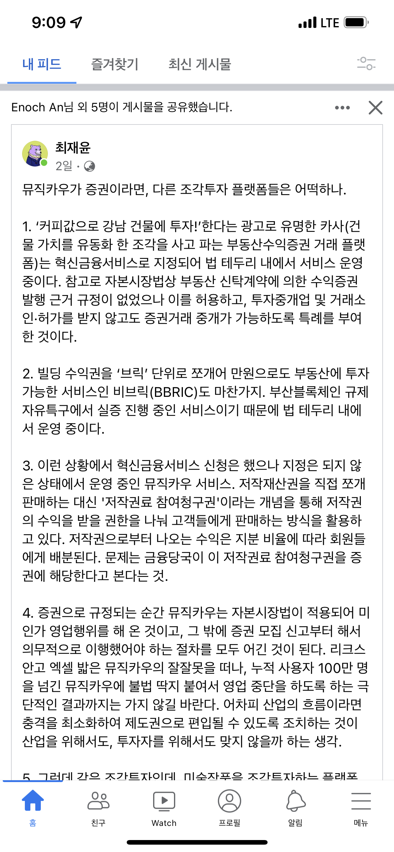 4. 증권으로 규정되는 순간 뮤직카우는 자본시장법이 적용되어 미인가 영업행위를 해 온 것이고, 그 밖에 증권 모집 신고부터 해서 의무적으로 이행했어야 하는 절차를 모두 어긴 것이 된다. 리크스 안고 엑셀 밟은 뮤직카우의 잘잘못을 떠나, 누적 사용자 100만 명을 넘긴 뮤직카우에 불법 딱지 붙여서 영업 중단을 하도록 하는 극단적인 결과까지는 가지 않길 바란다. 어차피 산업의 흐름이라면 충격을 최소화하여 제도권으로 편입될 수 있도록 조치하는 것이 산업을 위해서도, 투자자를 위해서도 맞지 않을까 하는 생각.