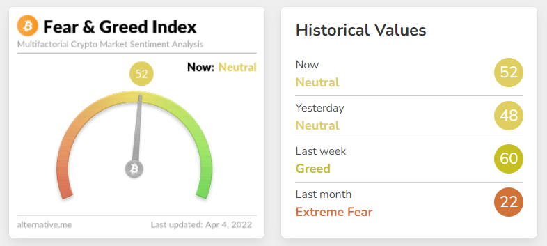 파이낸셜/트레이딩 아직 너무나도 neutral 무말랭이 2022. 4. 4. 12:03 https://alternative.me/crypto/fear-and-greed-index/ Crypto Fear & Greed Index - Bitcoin Sentiment The crypto fear & greed index of alternative.me provides an easy overview of the current sentiment of the Bitcoin / crypto market at a glance. alternative.me