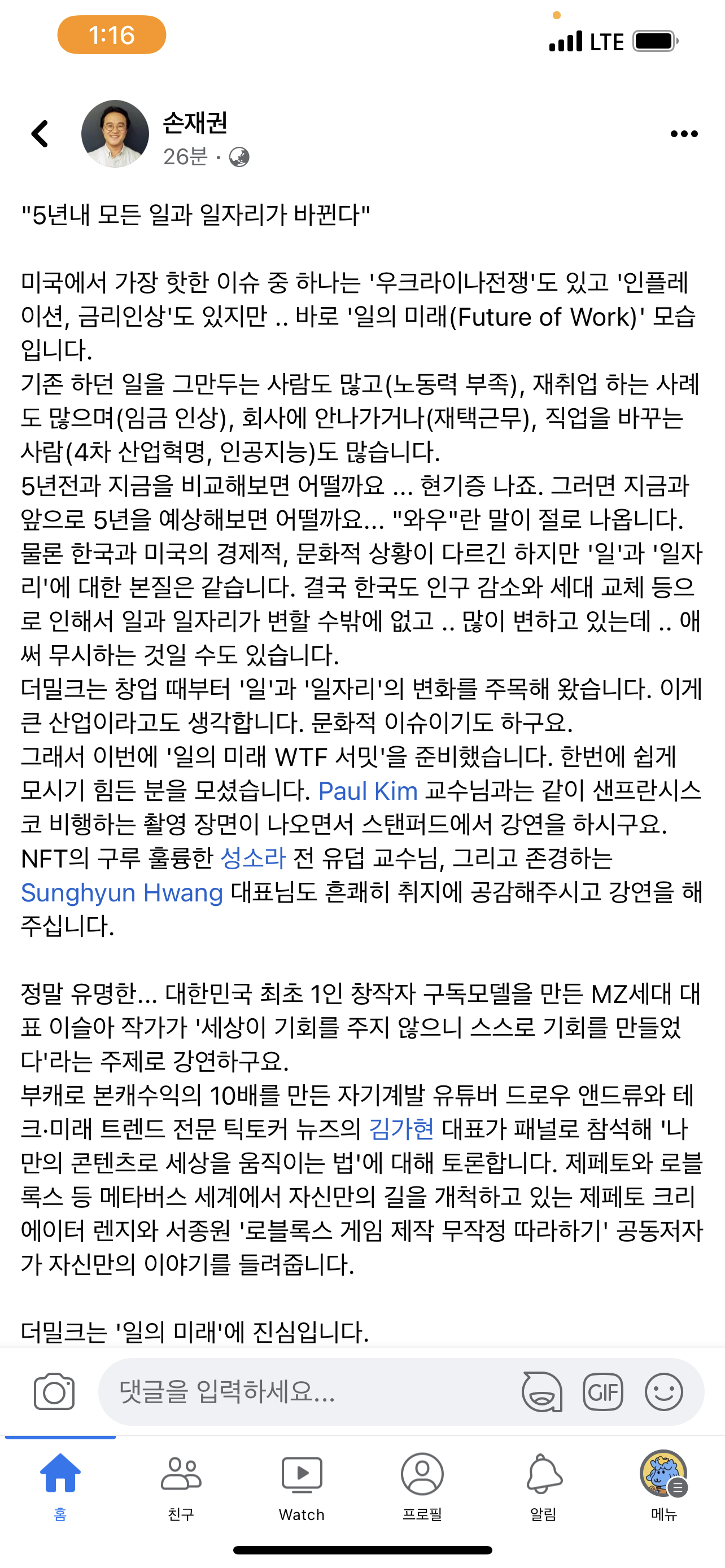 그래서 이번에 '일의 미래 WTF 서밋'을 준비했습니다. 한번에 쉽게 모시기 힘든 분을 모셨습니다. Paul Kim 교수님과는 같이 샌프란시스코 비행하는 촬영 장면이 나오면서 스탠퍼드에서 강연을 하시구요. NFT의 구루 훌륭한 성소라 전 유덥 교수님, 그리고 존경하는 Sunghyun Hwang 대표님도 흔쾌히 취지에 공감해주시고 강연을 해주십니다.