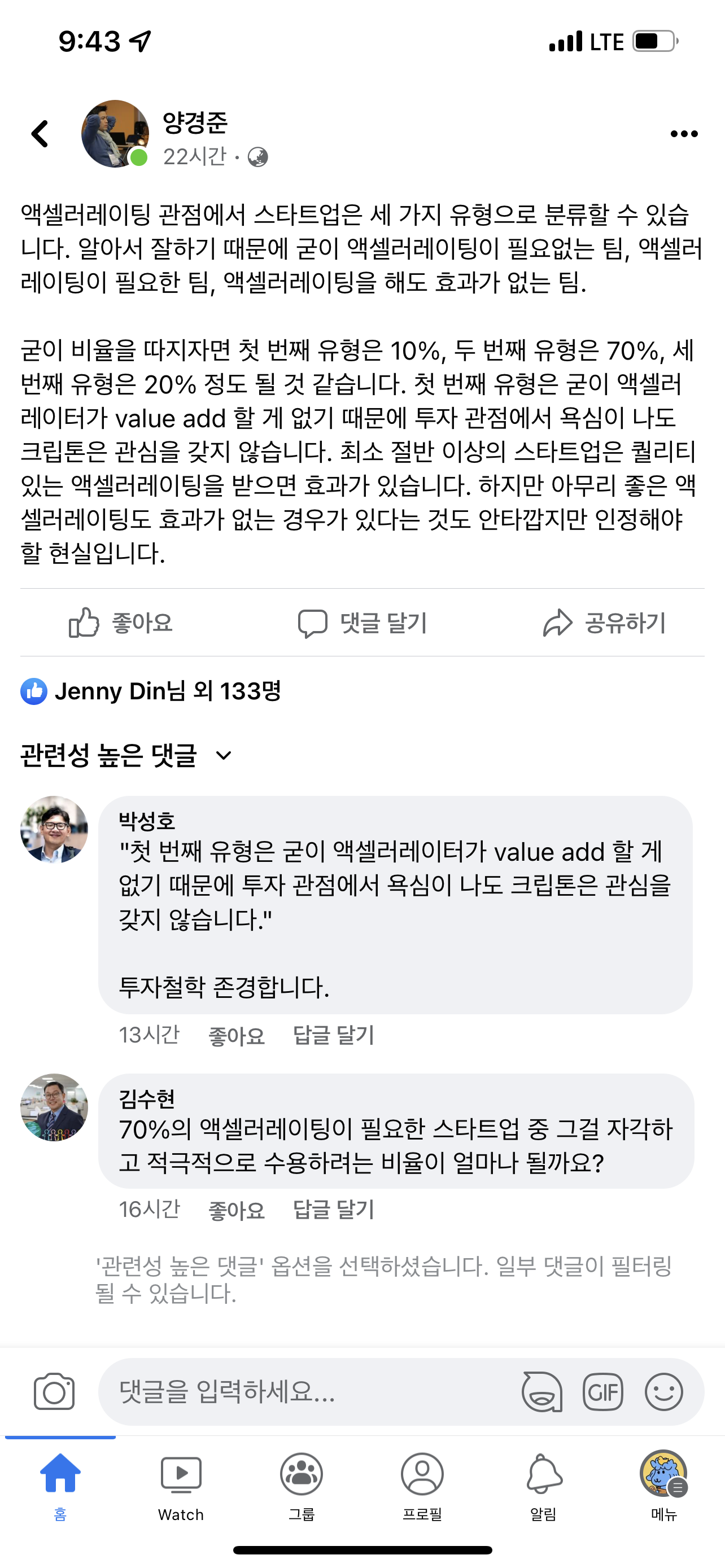 굳이 비율을 따지자면 첫 번째 유형은 10%, 두 번째 유형은 70%, 세 번째 유형은 20% 정도 될 것 같습니다. 첫 번째 유형은 굳이 액셀러레이터가 value add 할 게 없기 때문에 투자 관점에서 욕심이 나도 크립톤은 관심을 갖지 않습니다. 최소 절반 이상의 스타트업은 퀄리티 있는 액셀러레이팅을 받으면 효과가 있습니다. 하지만 아무리 좋은 액셀러레이팅도 효과가 없는 경우가 있다는 것도 안타깝지만 인정해야 할 현실입니다.