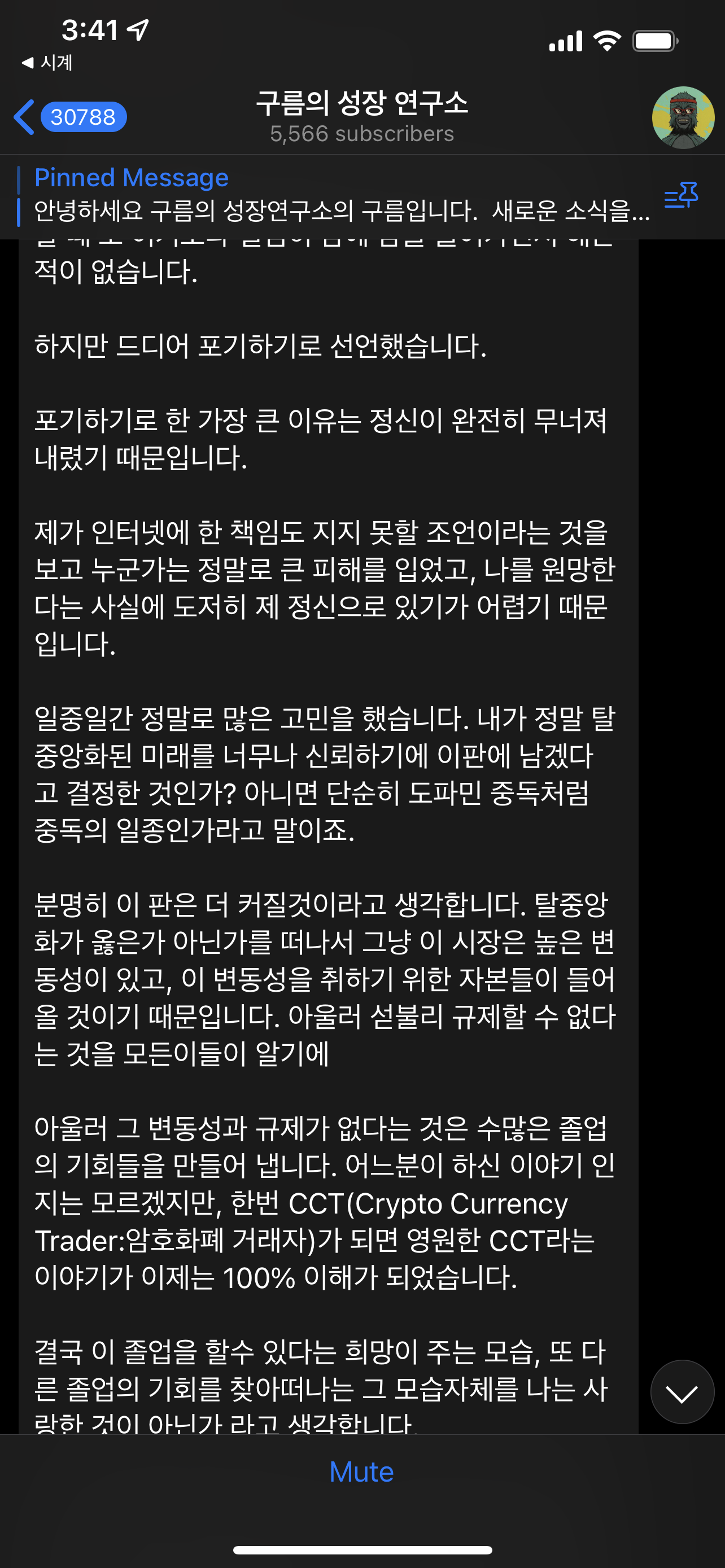 분명히 멀쩡히 잘 살고 즐겁게 사는 사람들은 그런 글들을 쓰지 않아서라고 할 수 있겠지만, 여기에 미쳐서 내가 눈만뜨면 바이낸스 앱부터 키는 모습, 트위터에 무슨 새로운 이슈가 없는지 찾아다니는 모습, 하루에 수십번도 울리는 텔레그램, 커뮤니티를 운영하겠다고 진짜 나의 커뮤니티에는 소홀해지는 모습 들을 보면서 나도 시장의 비이성을 찾아 결국 졸업을해도 똑같겠구나 라는 생각이 들었습니다.