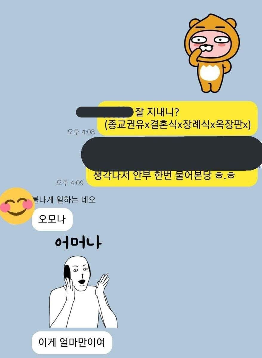 ○○야, 잘 지내니? (종교권유×, 결혼식×, 돌잔치×, 장례식×, 카드 만들기×, 돈 빌리기×, 옥장판×, 다단계×, 보증×, 보험×, 건강식품×, 정수기×) 생각 나서 안부 물어본다. ㅎㅎㅎ