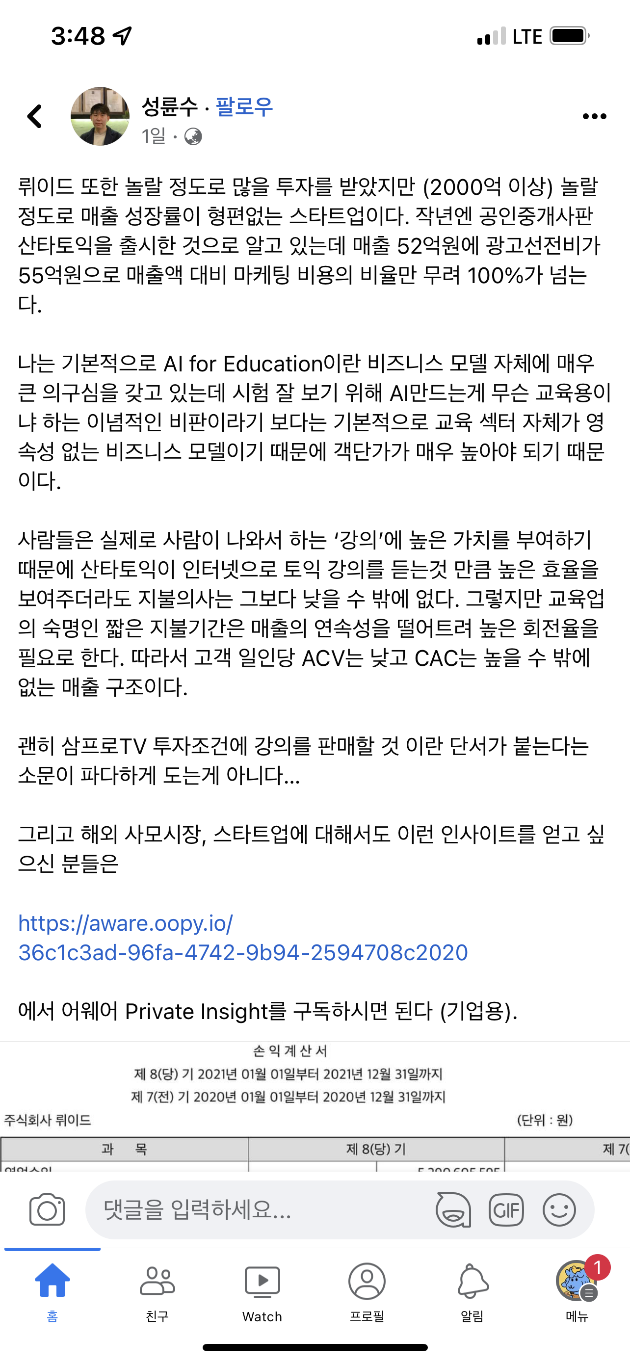 뤼이드 또한 놀랄 정도로 많을 투자를 받았지만 (2000억 이상) 놀랄 정도로 매출 성장률이 형편없는 스타트업이다. 작년엔 공인중개사판 산타토익을 출시한 것으로 알고 있는데 매출 52억원에 광고선전비가 55억원으로 매출액 대비 마케팅 비용의 비율만 무려 100%가 넘는다.