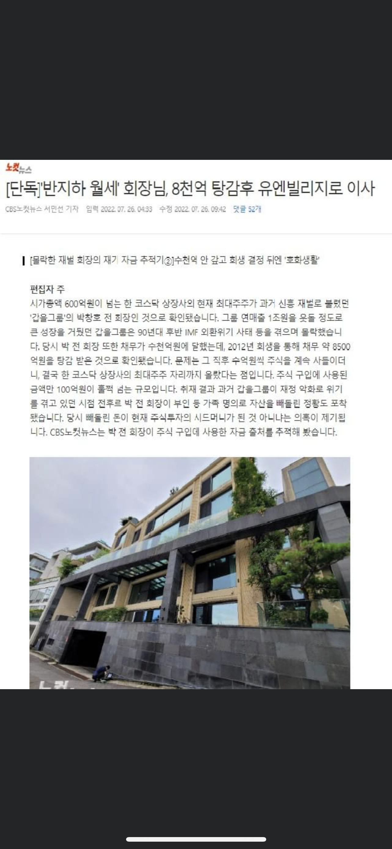 [단독]'반지하 월세' 회장님, 8천억 탕감 후 유엔빌리지로 이사(https://news.v.daum.net/v/20220726043300219)