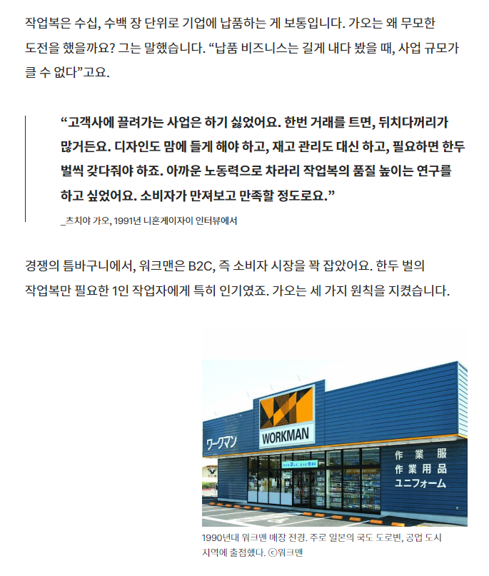 “우리가 일반적인 의류 시장에 나가 승부하면 반드시 집니다. 워크맨이 잘하는 것에 확실히 집중해야 해요. 지금 파는 제품을 무리하게 바꾸거나 확장시키지 않는 것. 그것이 오래 가는 기업의 비결입니다.”