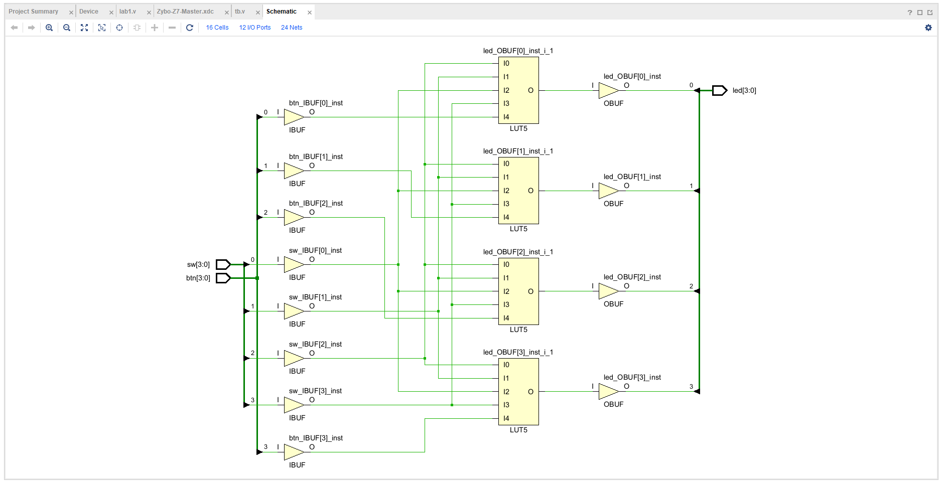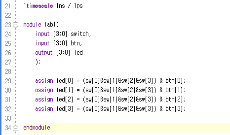 스위치[3:0]가 모두 켜져있고, 버튼[3:0]이 눌리면, 버튼에 대응하는 LED[3:0]이 동작하게끔 하자. (변형함)