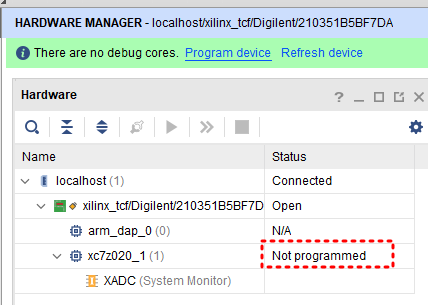 open hw manager 한다. (open target, auto connect)