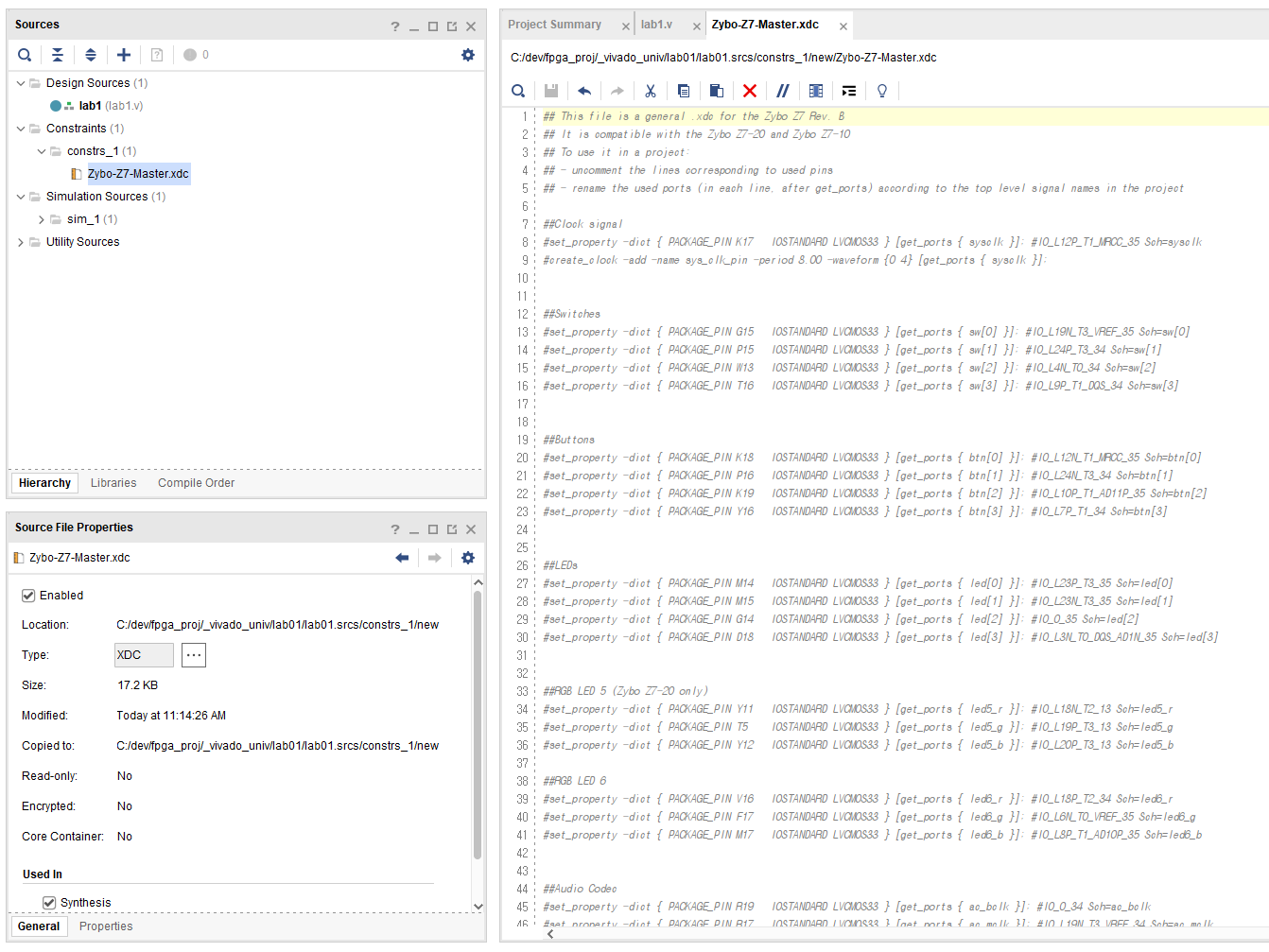 이때 Zybo-Z7-Master.xdc 파일을 사용하면 된다. 적절히 변형하여 활용하자.