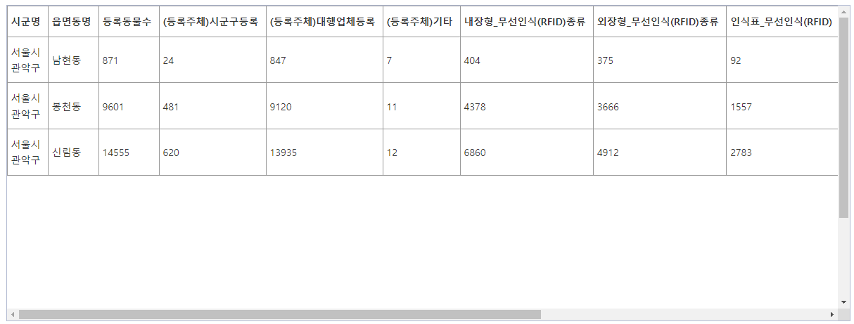 사업 모티프2/반려견&반려동물 서울특별시_관악구_반려동물 등록현황 무말랭이 2022. 8. 16. 13:39 https://www.data.go.kr/data/15040346/fileData.do 서울특별시_관악구_반려동물 등록현황_20210222 서울특별시 관악구 반려동물 등록현황 정보를 법정동별로 등록동물수, 등록주체, 무선인식 종류, 등록품종수, 등록소유자수, 동물소유자당 등록동물수 등을 제공합니다. www.data.go.kr